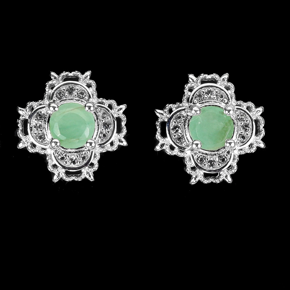 Oferujemy Państwu pozłacane białym złotem 14K, srebrne - próba 925 - kolczyki z naturalnymi szmaragdami i białymi topazami.