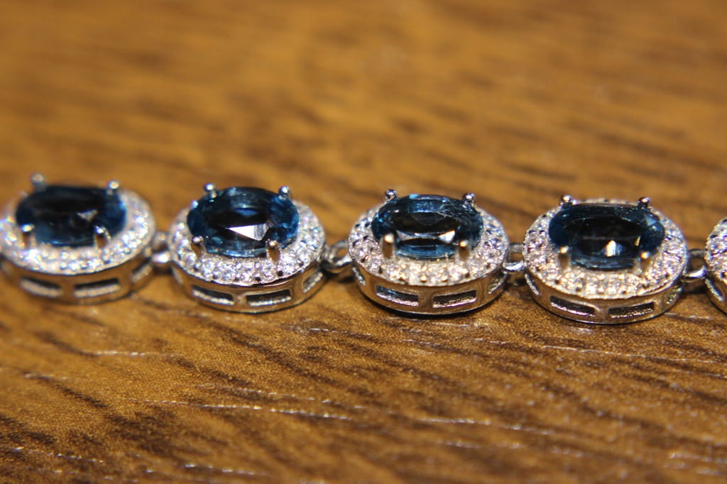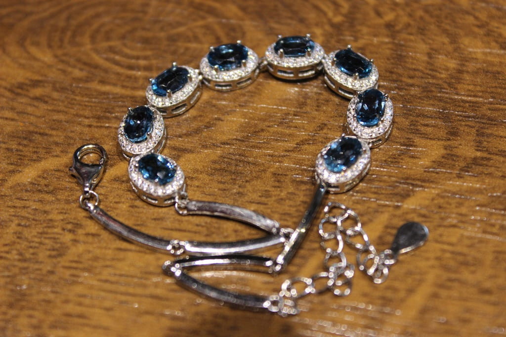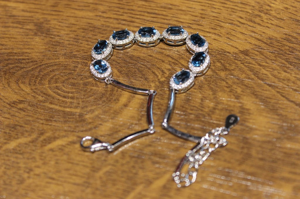 Oferujemy Państwu nową, pozłacaną białym 14K złotem, srebrną - próba 925 bransoletkę z naturalnymi topazami london blue i cyrkoniami.