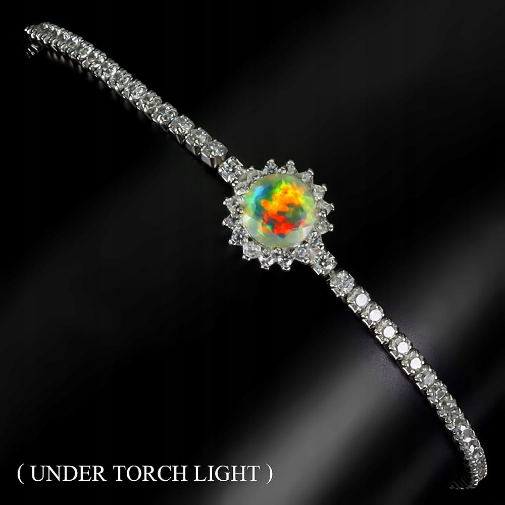 Oferujemy Państwu pozłacaną białym złotem 14K, srebrną - próba 925 - bransoletkę z naturalnym ognistym opalem i cyrkoniami.