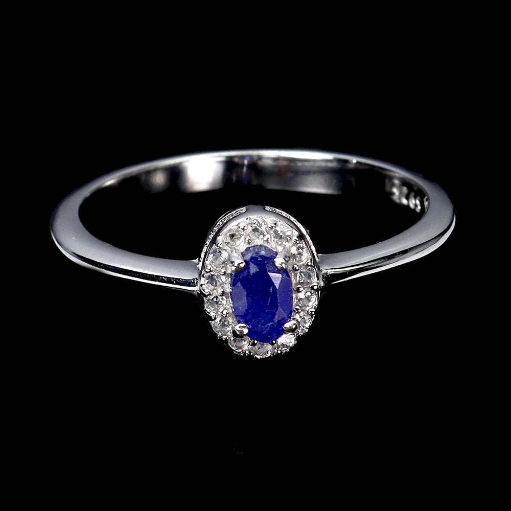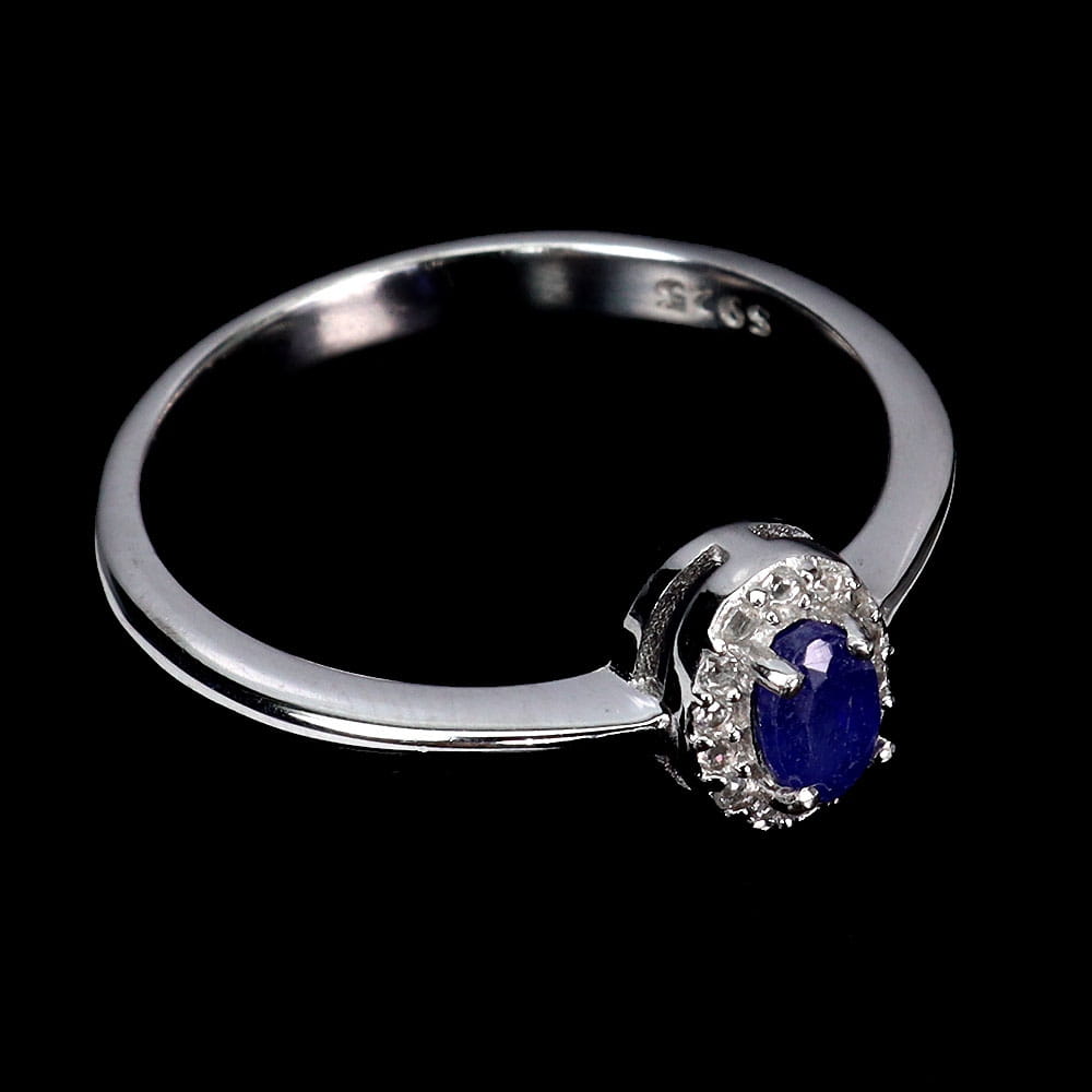 925 Delikatny pierścionek naturalny niebieski szafir białe topazy r 14