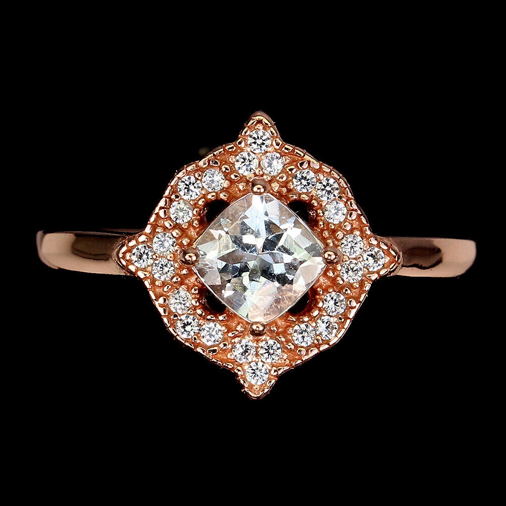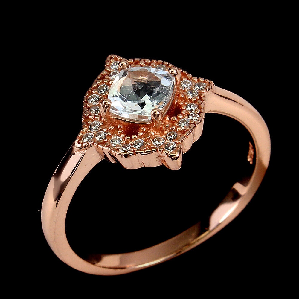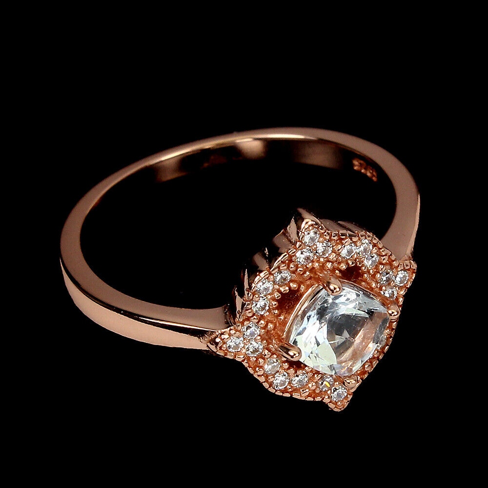 Oferujemy Państwu nowy, srebrny - próba 925- pozłacany 14K różowym złotem pierścionek z naturalnym akwamarynem i cyrkoniami.