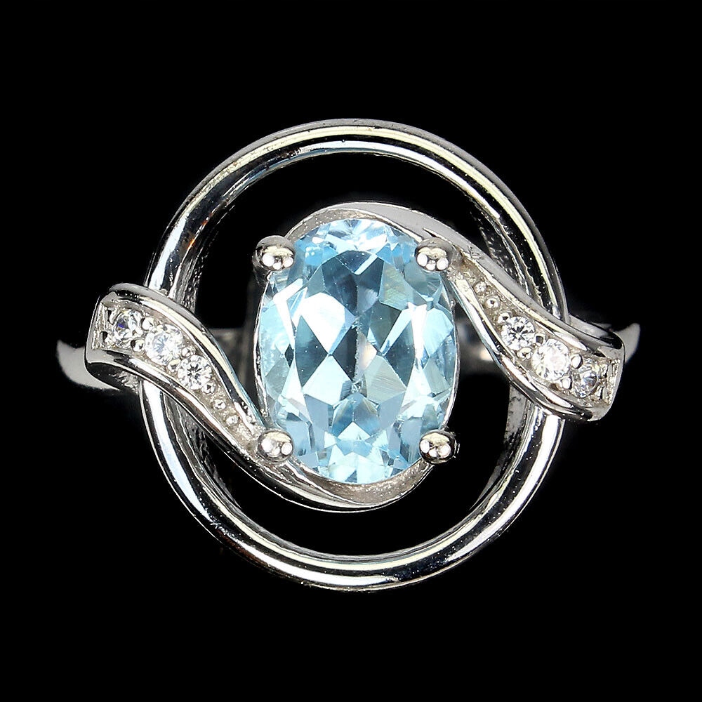Oferujemy Państwu nowy, pozłacany 14K białym złotem, srebrny - próba 925 - pierścionek z naturalnym sky blue topazem i cyrkoniami.
