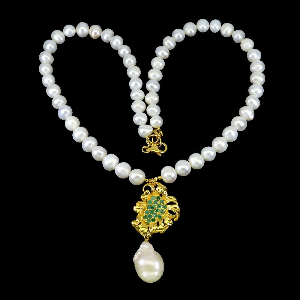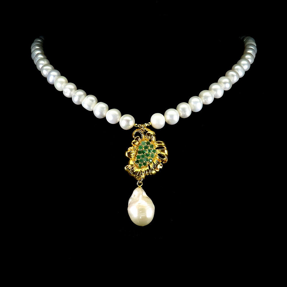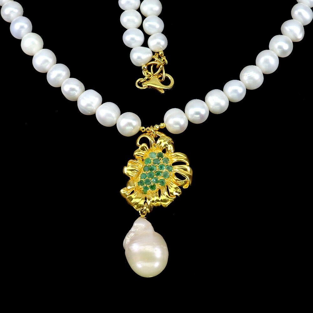 Oferujemy Państwu nowy, pozłacany 14K żółtym złotem, srebrny - próba 925 naszyjnik z naturalnymi szmaragdami i perłami.