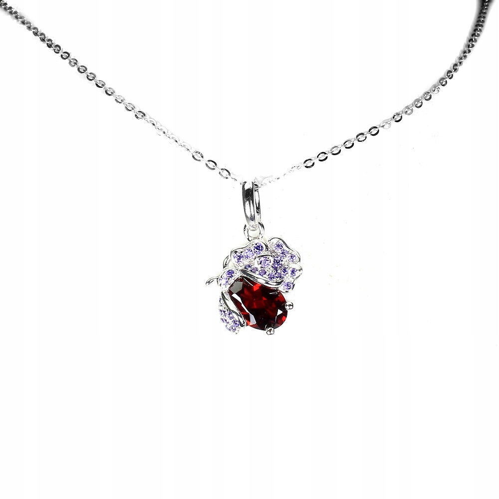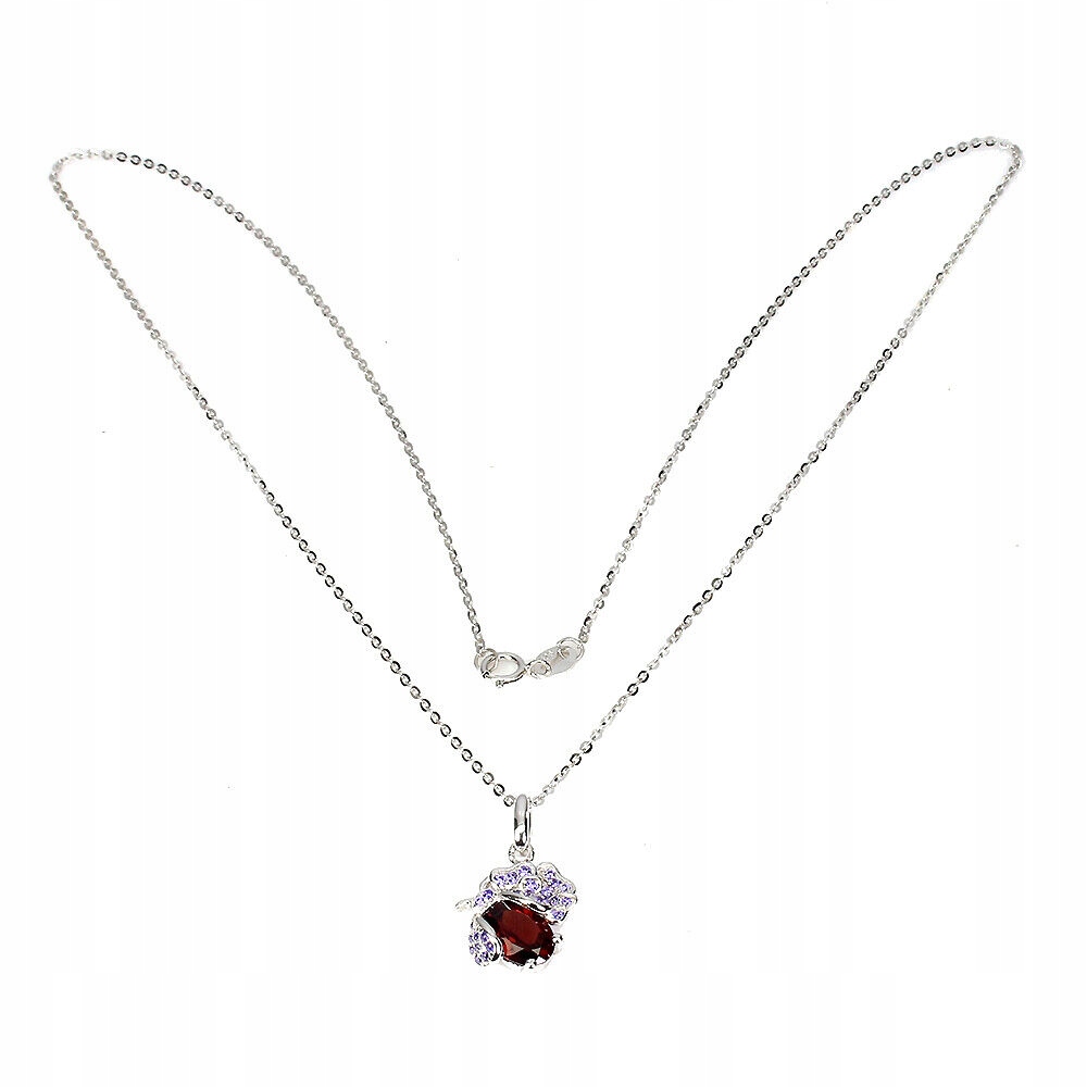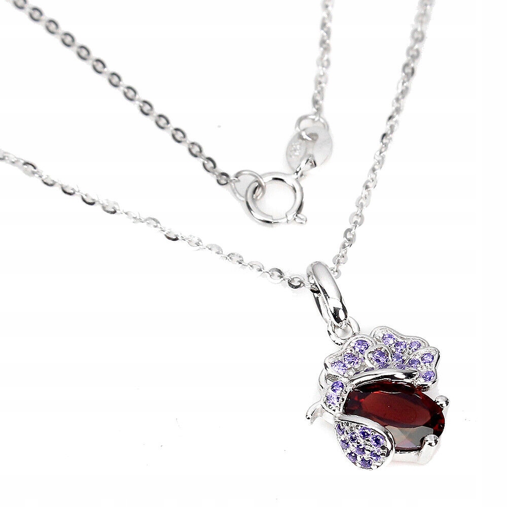 Oferujemy Państwu nowy, pozłacany 14K białym złotem, srebrny - próba 925 naszyjnik z naturalnym granatem i cyrkoniami. Urocza biedronka.