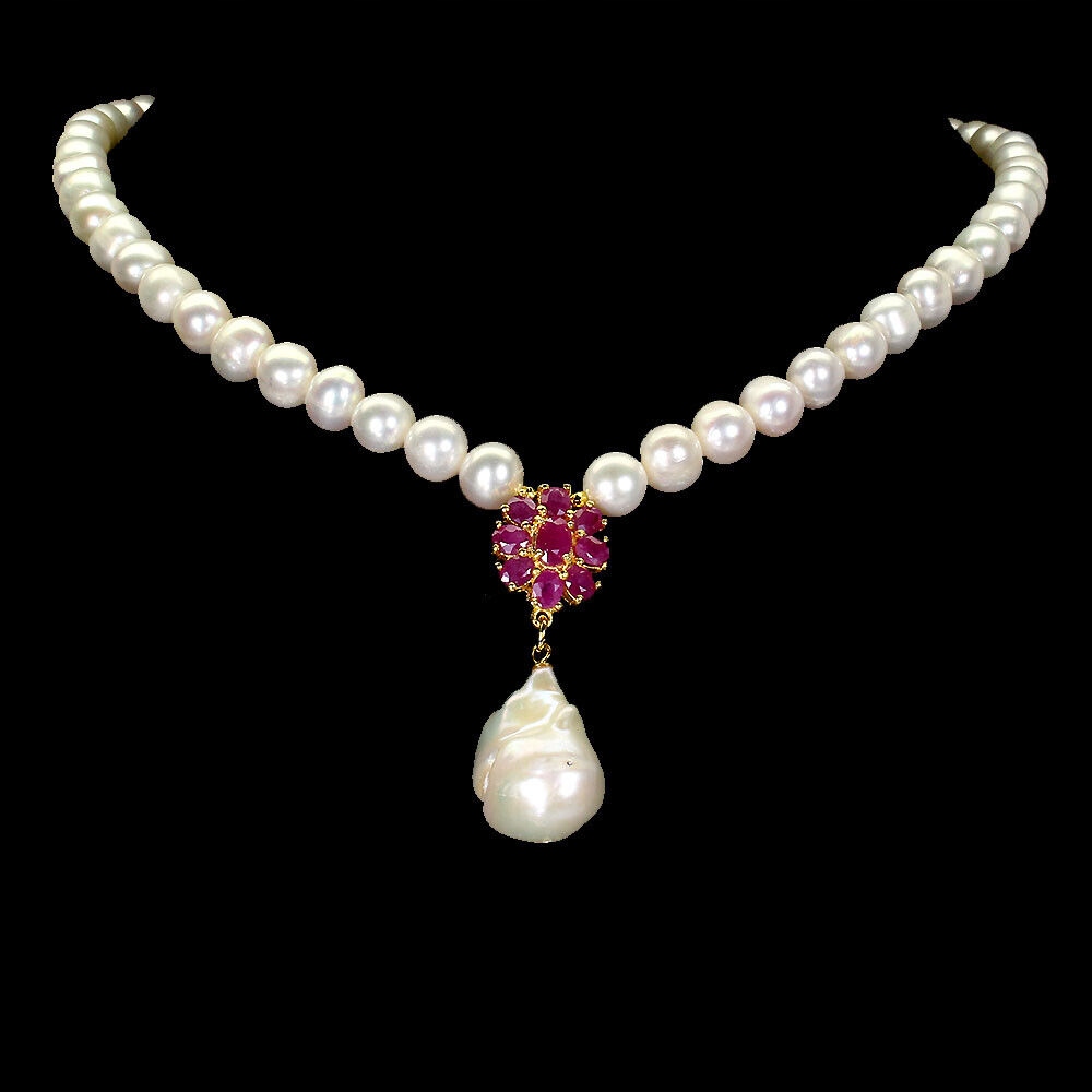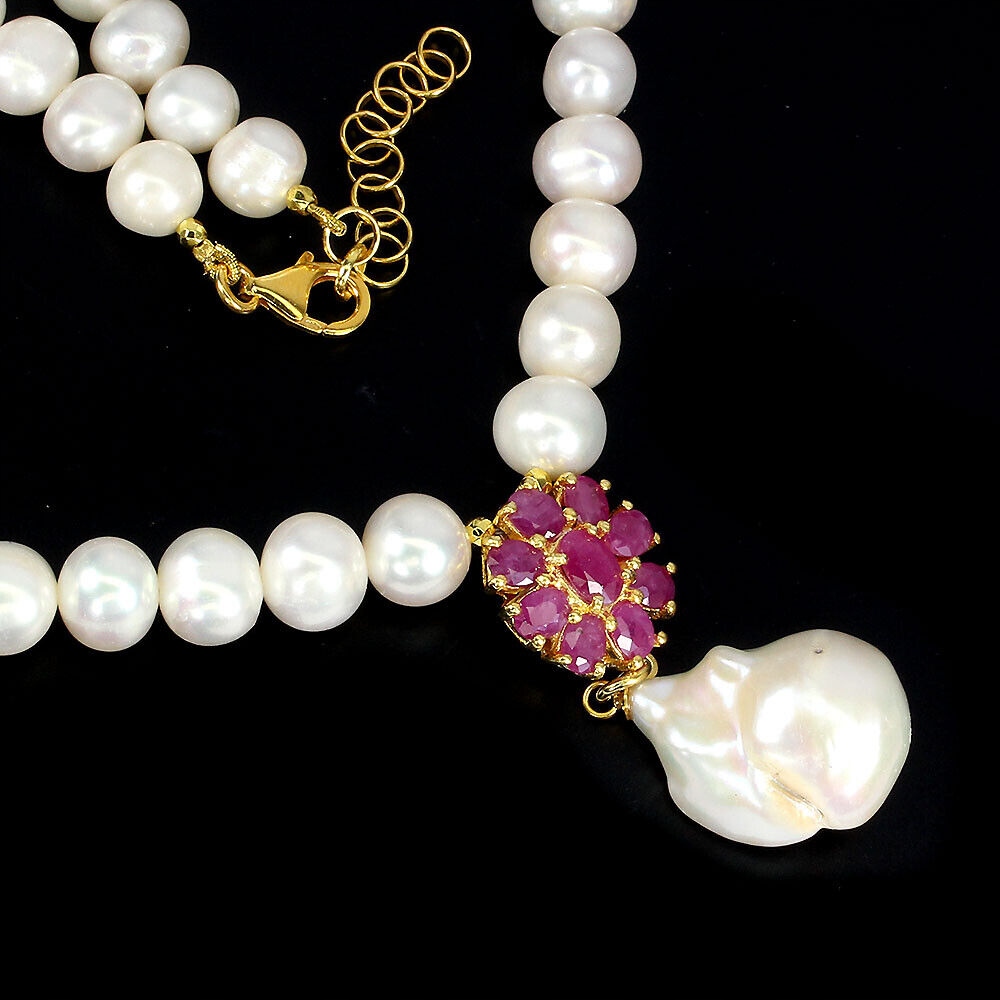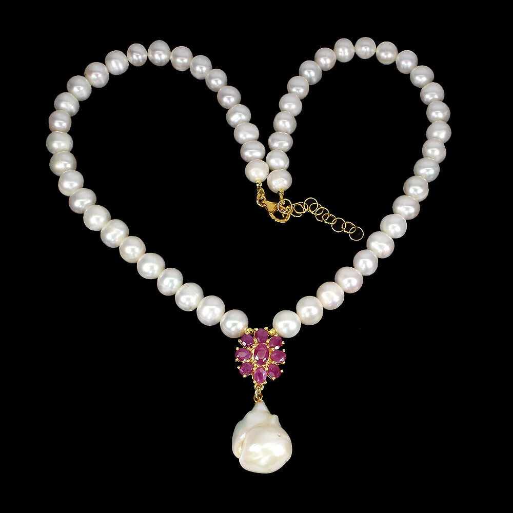 Oferujemy Państwu nowy, pozłacany 14K żółtym złotem, srebrny - próba 925 naszyjnik z naturalnymi perłami i rubinami.