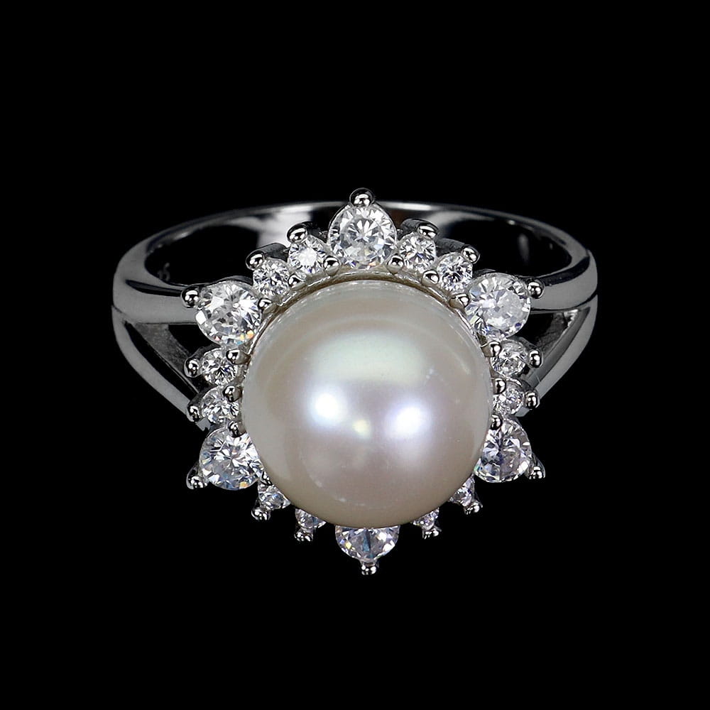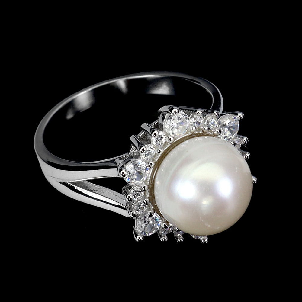Oferujemy Państwu pozłacany białym 14K złotem, srebrny - próba 925 pierścionek z naturalną perłą i cyrkoniami.