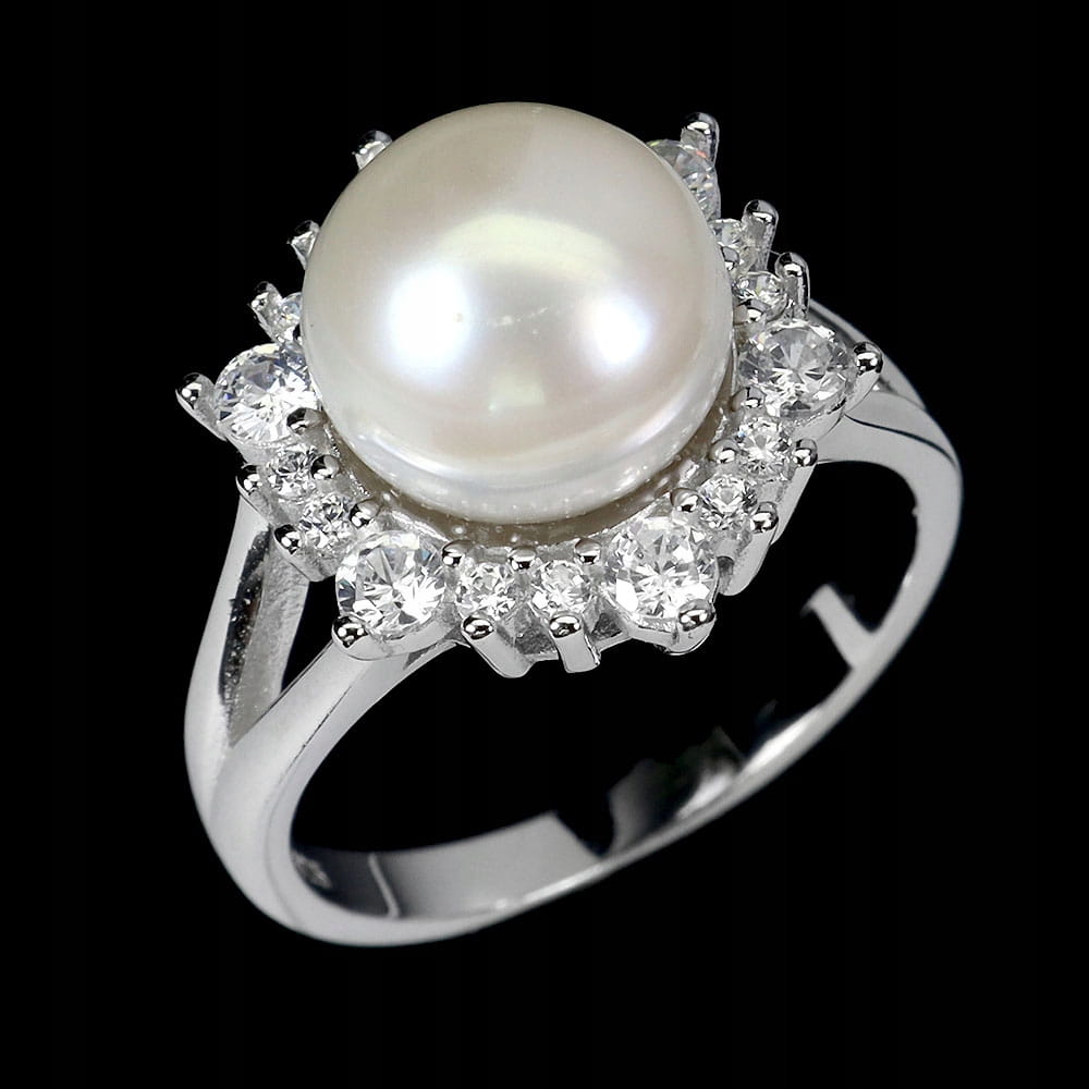 925 Pierścionek srebro elegancki naturalna kremowa perła cyrkonie r 14