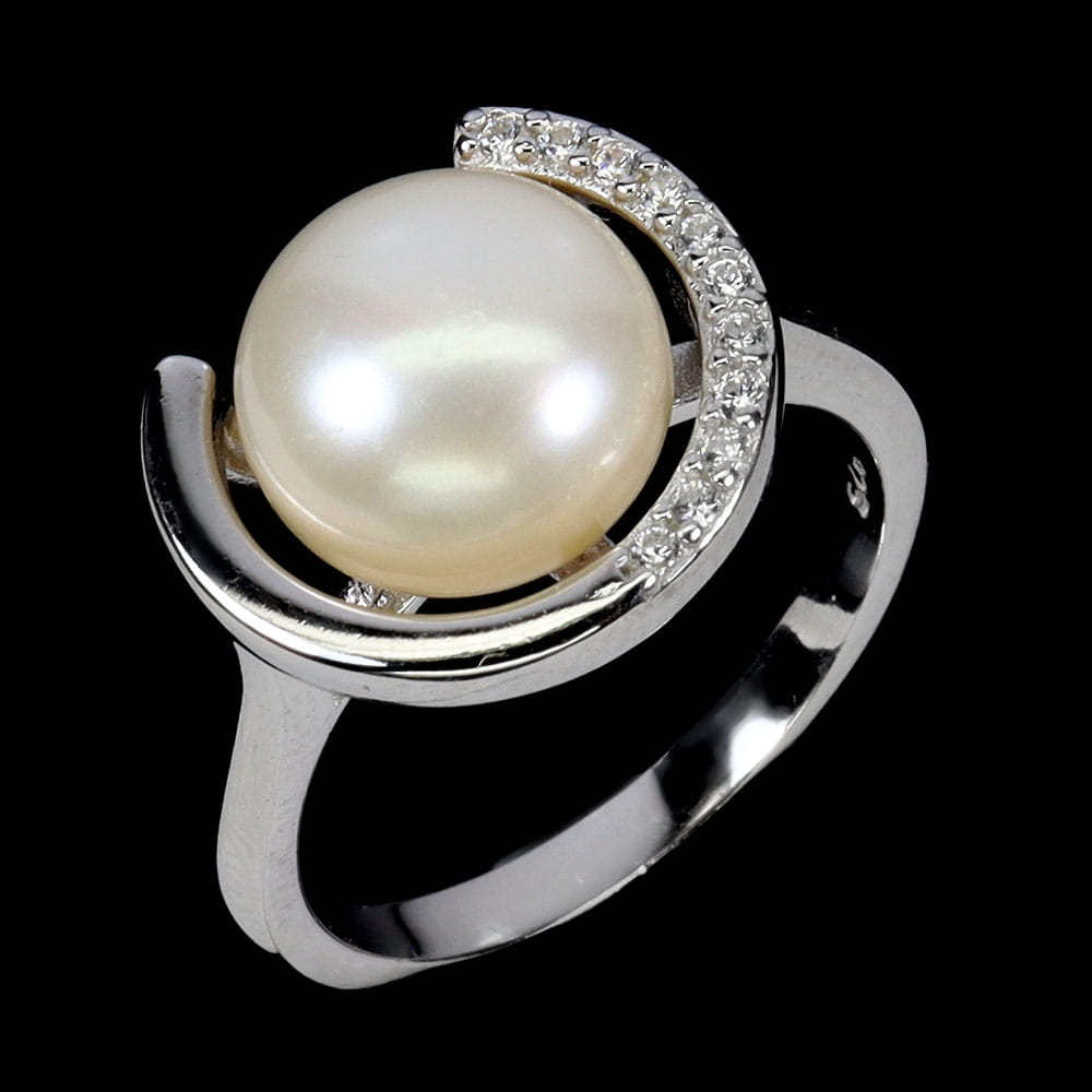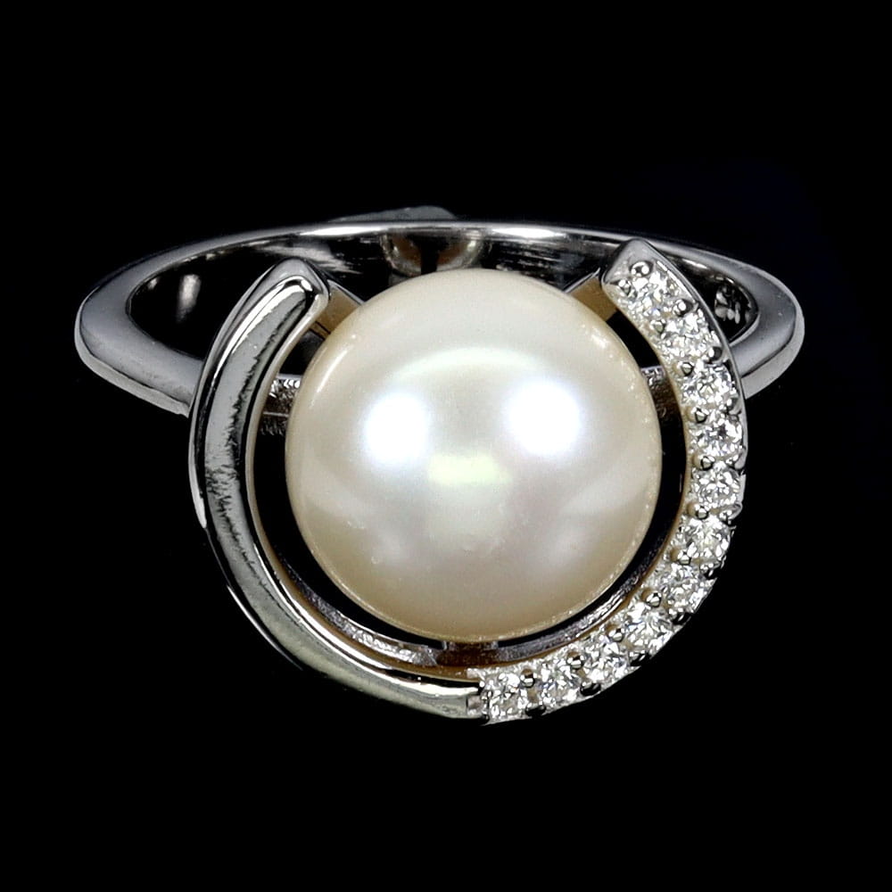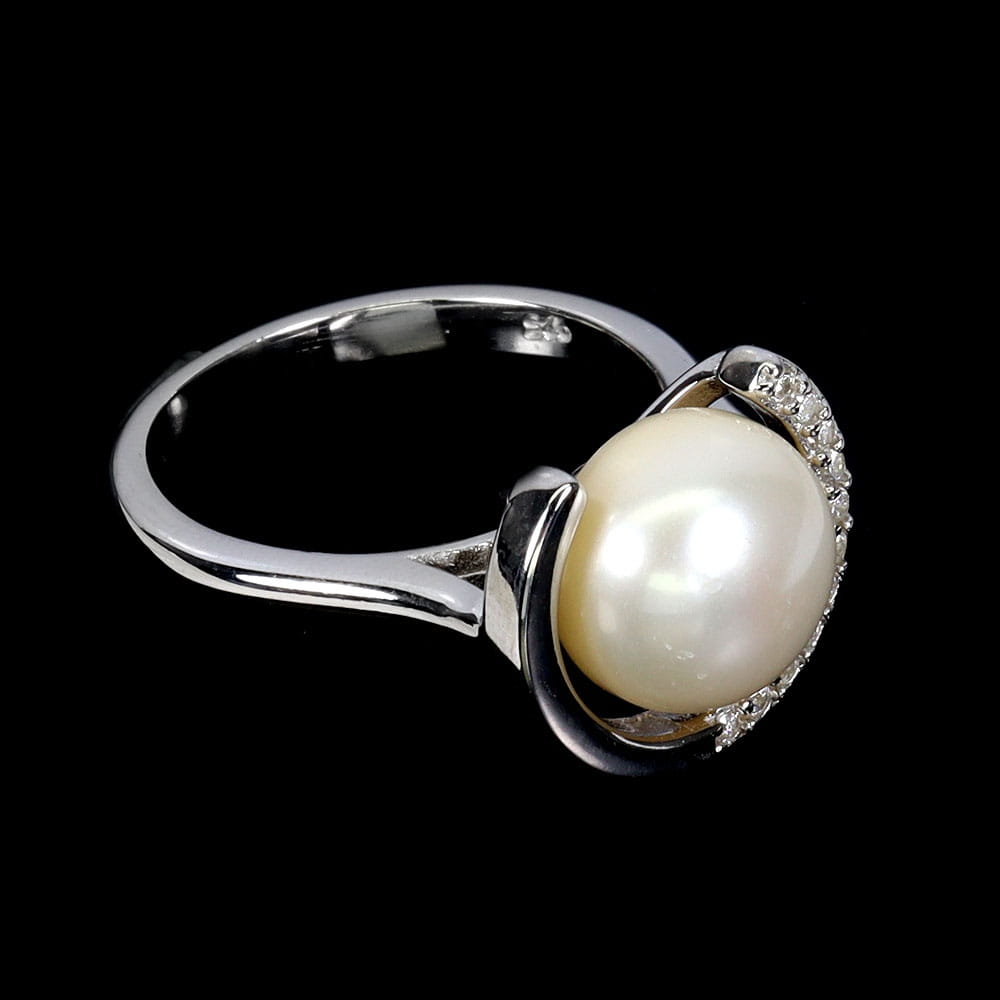Oferujemy Państwu pozłacany białym 14K złotem, srebrny - próba 925 pierścionek z naturalną perłą i cyrkoniami.