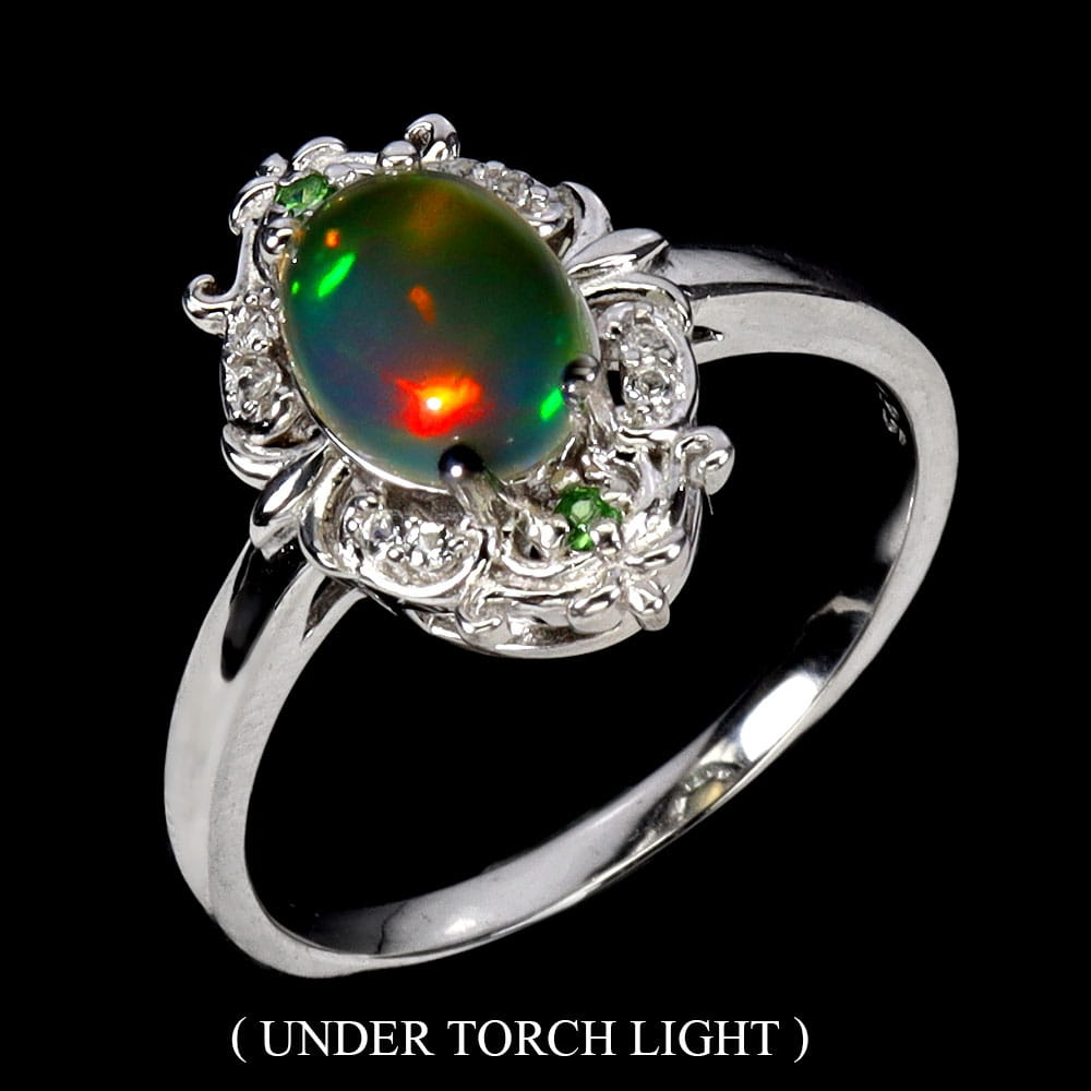 Oferujemy Państwu pozłacany białym 14K złotem, srebrny - próba 925 - pierścionek z naturalnym opalem ognistym, diopsydami i białymi topazami.