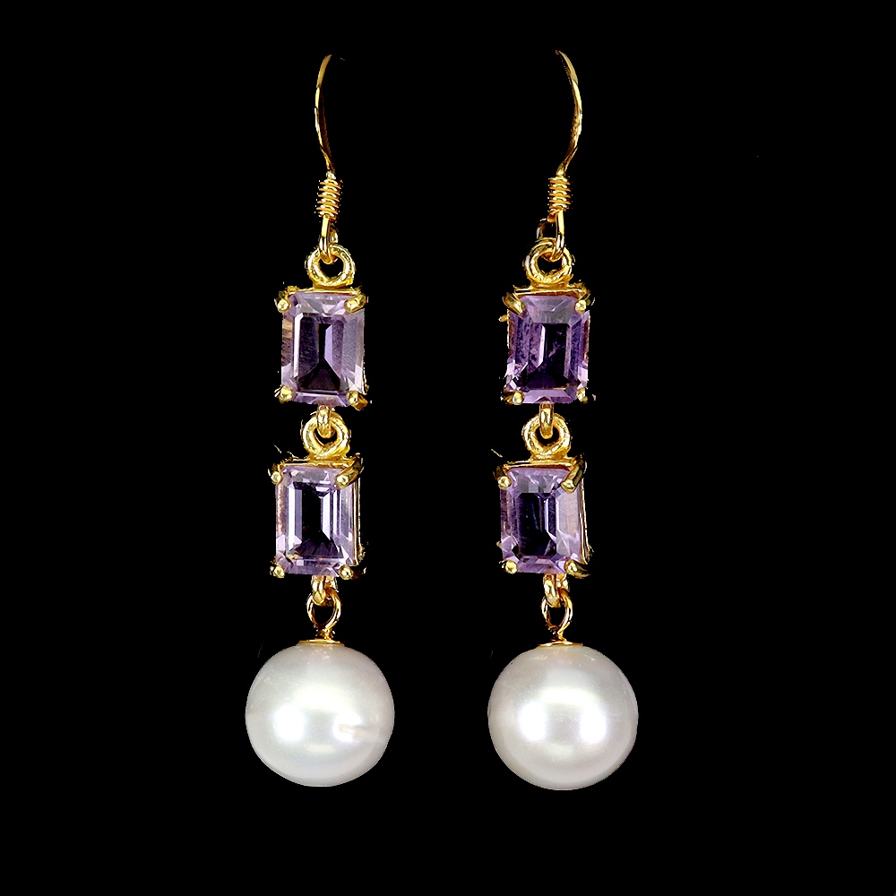 Oferujemy Państwu pozłacane żółtym złotem 14K, srebrne próba 925 kolczyki z naturalnymi ametystami i perłami.
