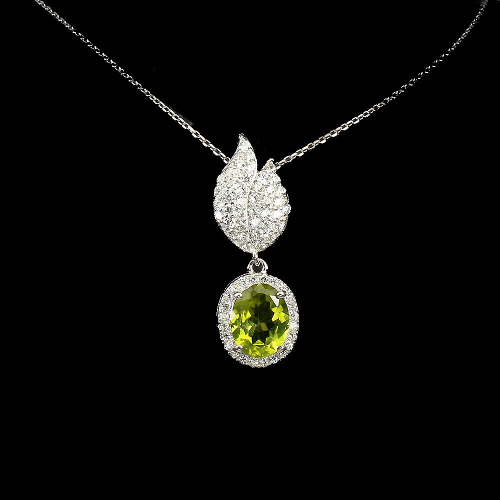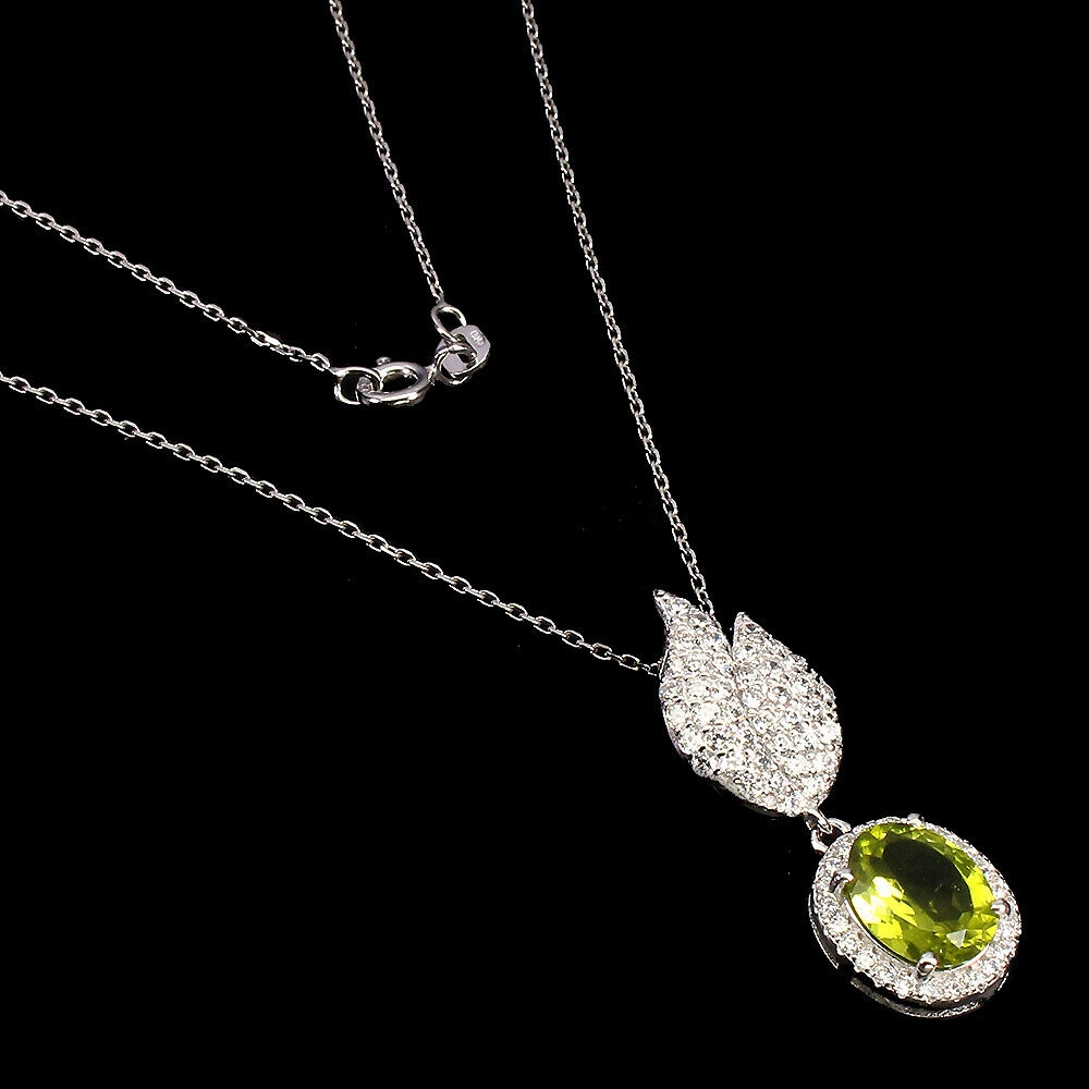 Oferujemy Państwu nowy, pozłacany 14K białym złotem, srebrny - próba 925 naszyjnik z naturalnym oliwinem i cyrkoniami.