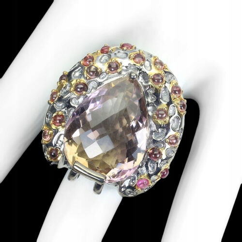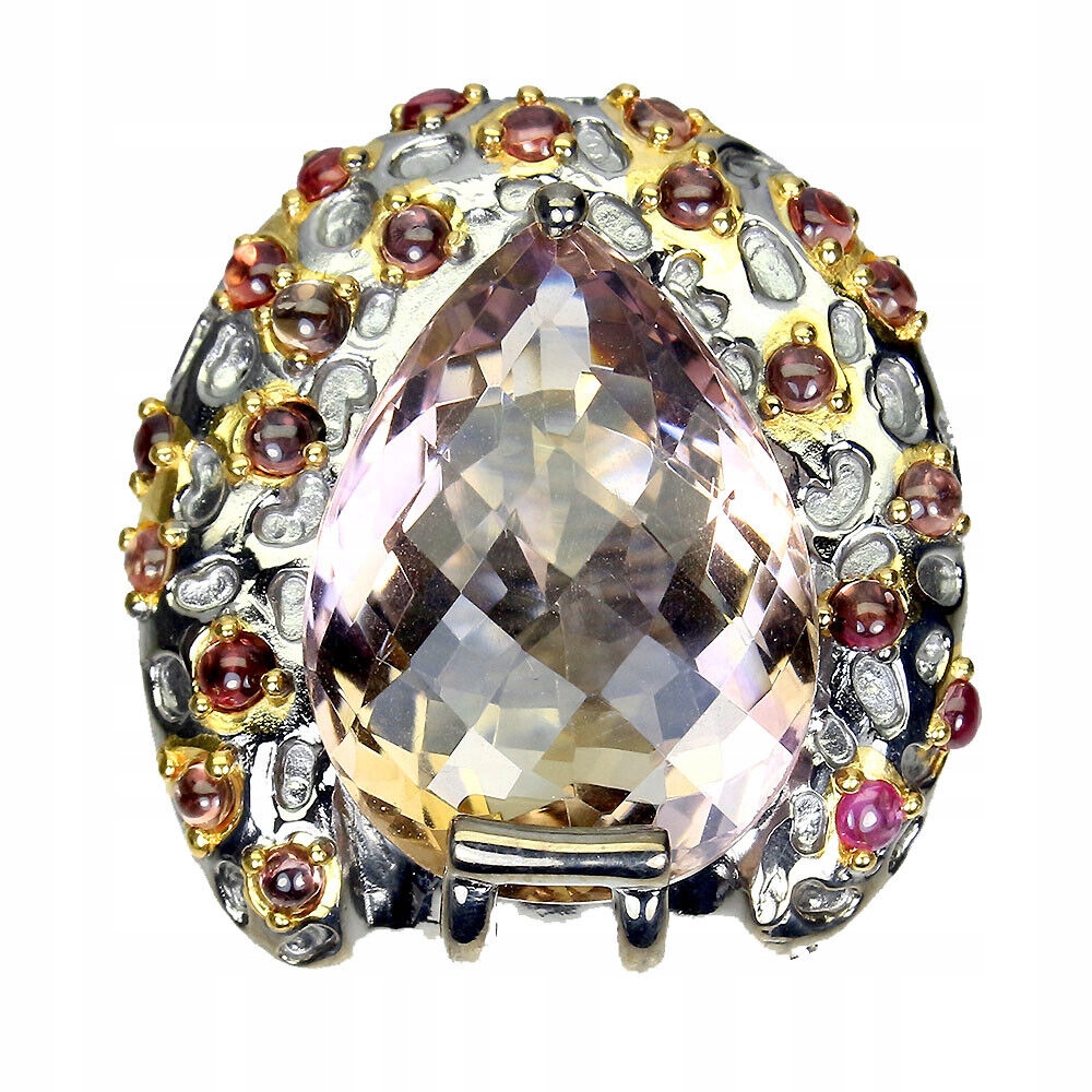 Oferujemy Państwu nowy, pozłacany 14K żółtym złotem i pokryty czarnym rodem, srebrny - próba 925 pierścionek z naturalnym dwukolorowym ametrynem 26ct i szafirami Songea.