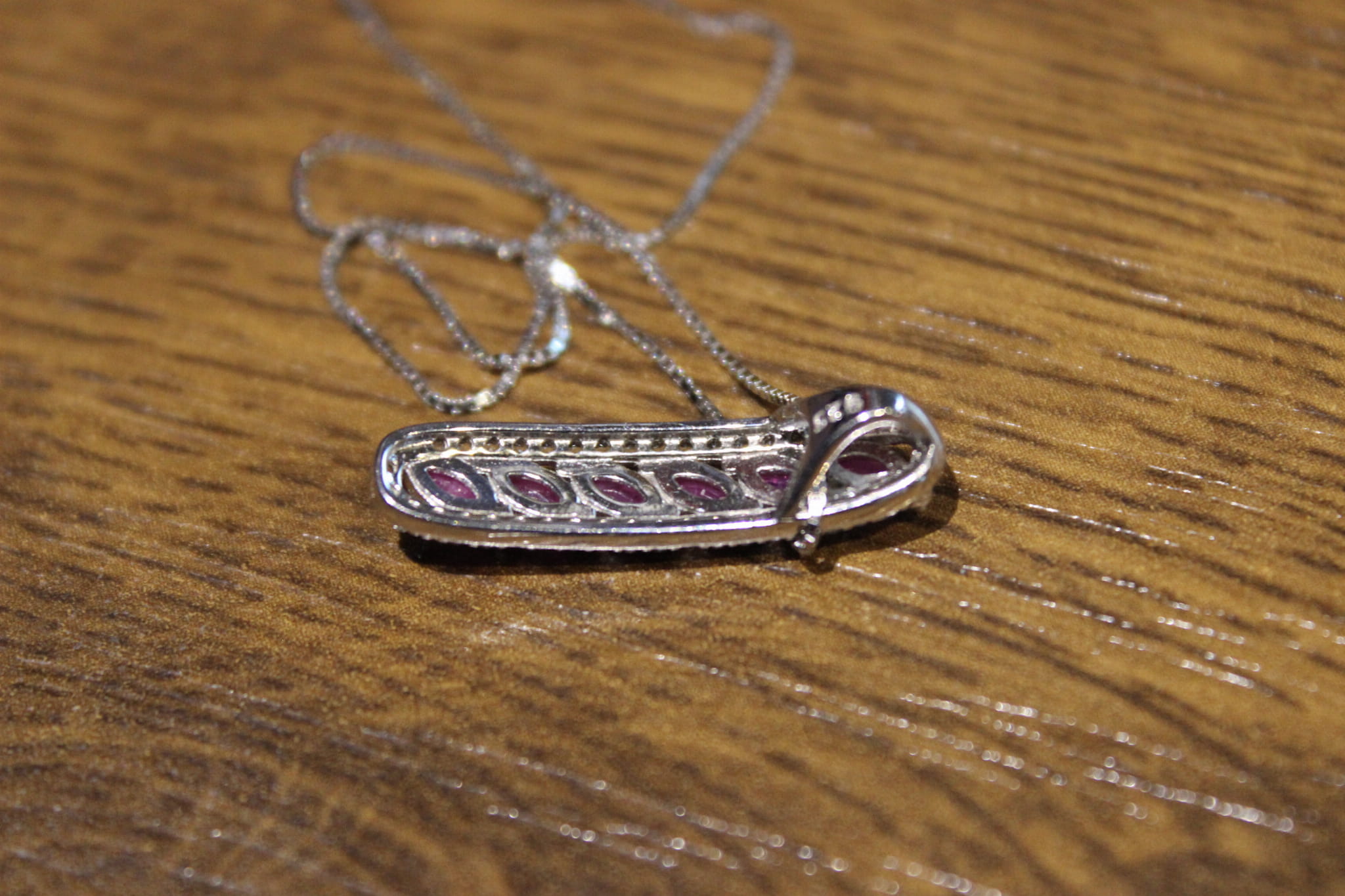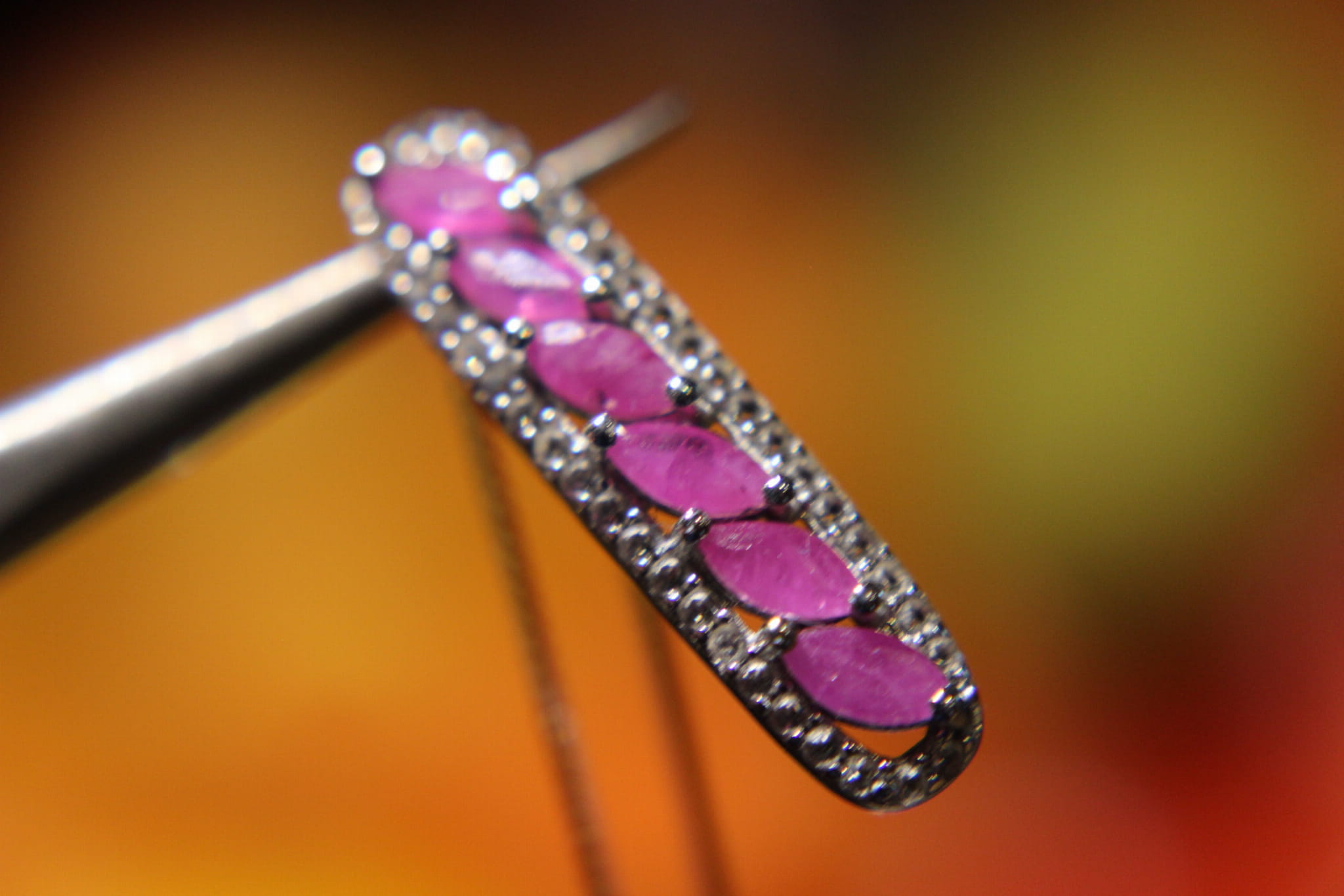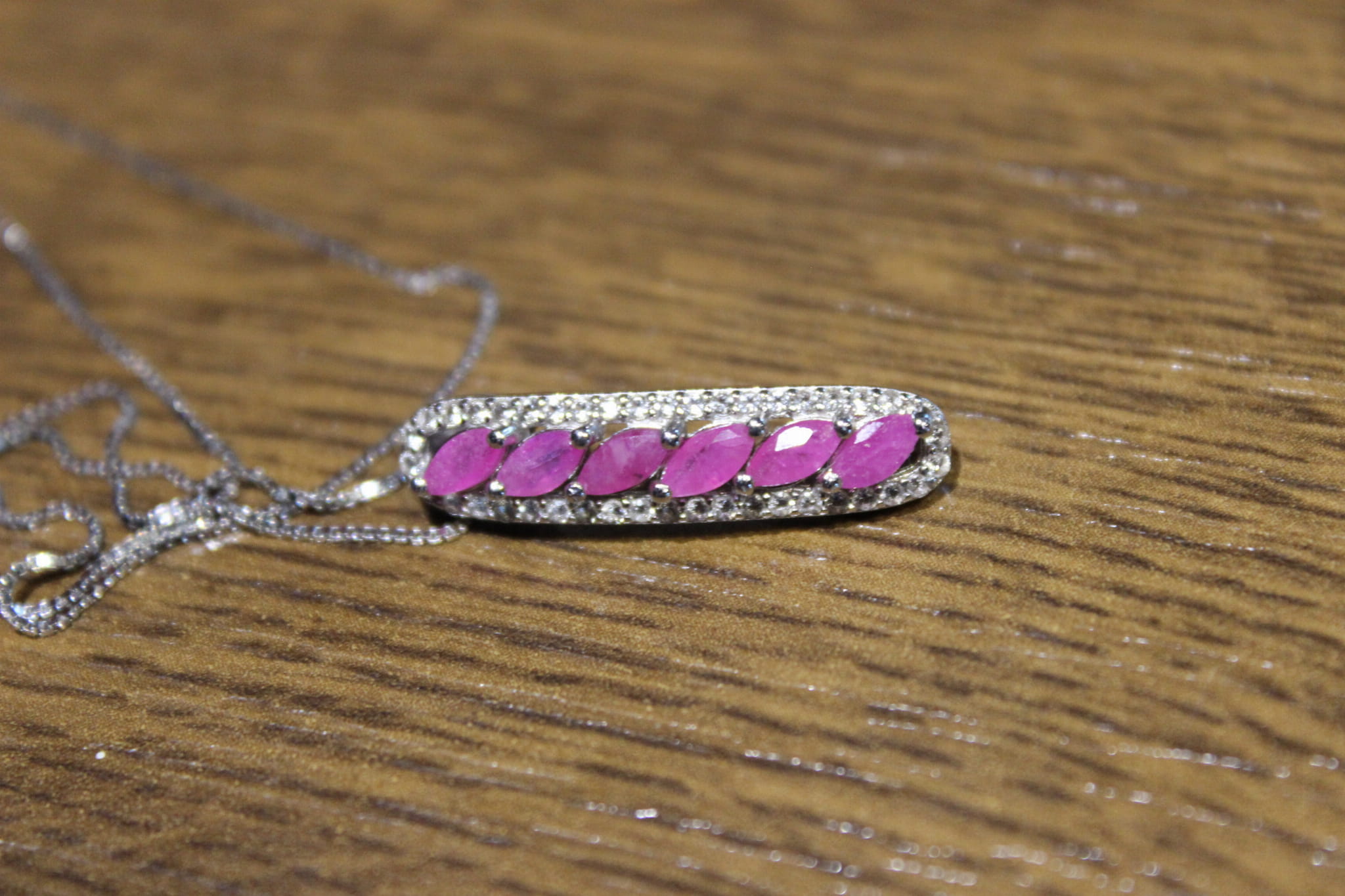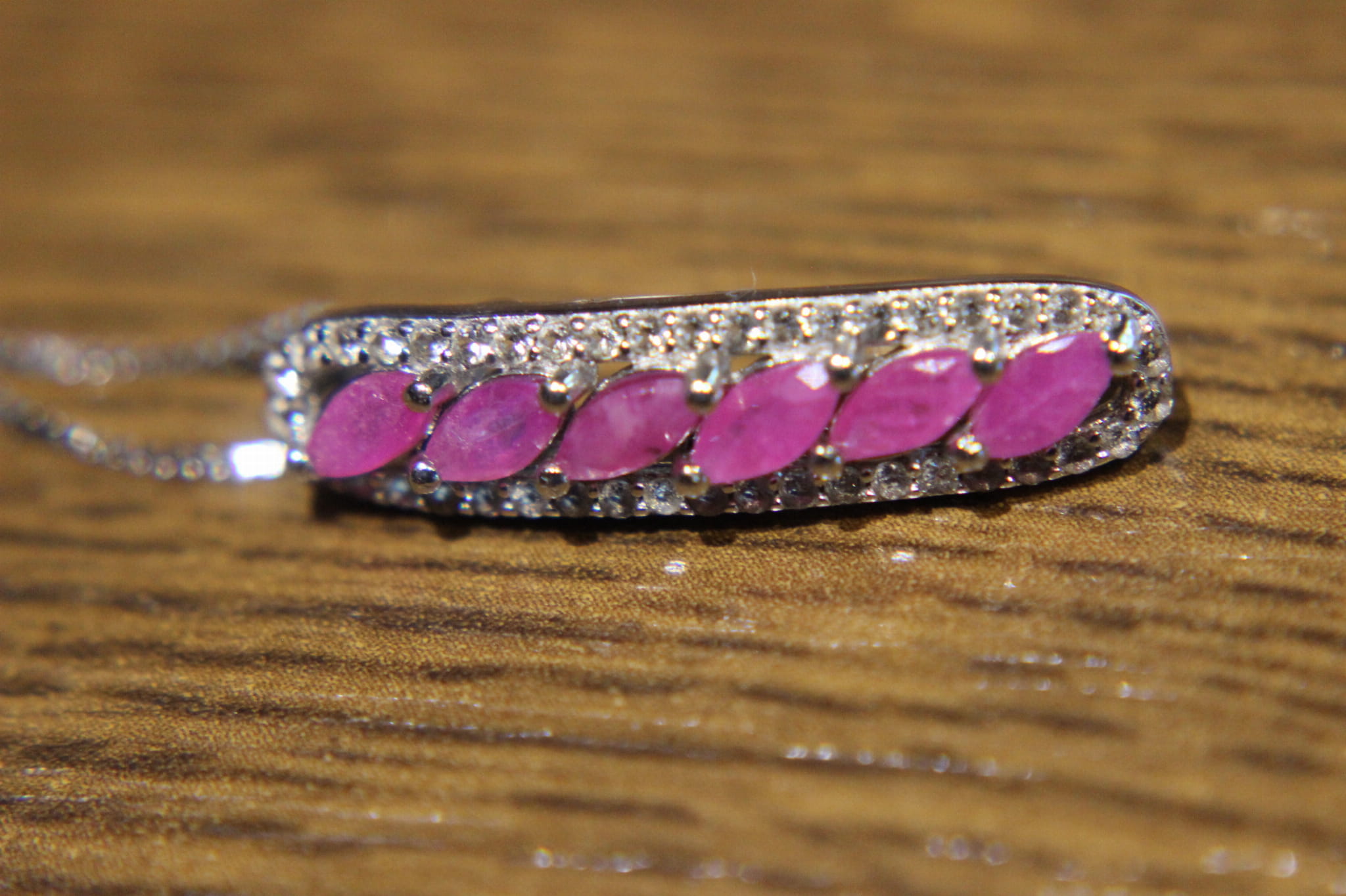 Oferujemy Państwu nowy, pozłacany 14K białym złotem, srebrny - próba 925 naszyjnik z naturalnymi rubinami i białymi topazami.