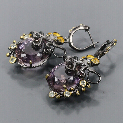 Oferujemy Państwu nowe, pozłacane żółtym złotem i pokryte czarnym rodem, srebrne - próba 925 kolczyki z naturalnymi ametrynami łącznie ponad 75ct, szafirami i topazami. Piękne ośmiornice.