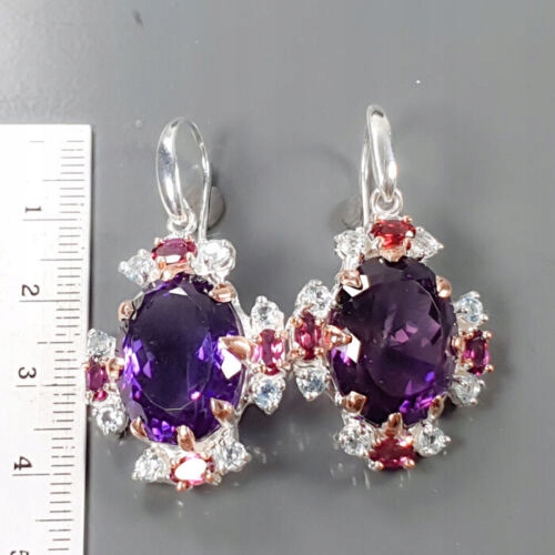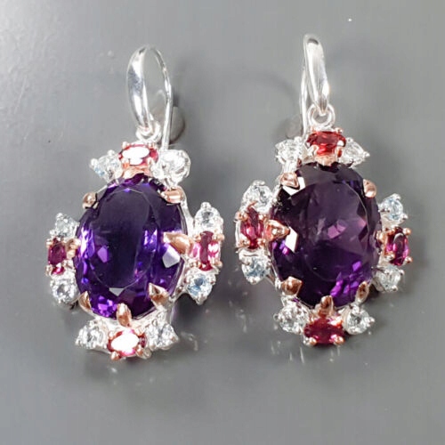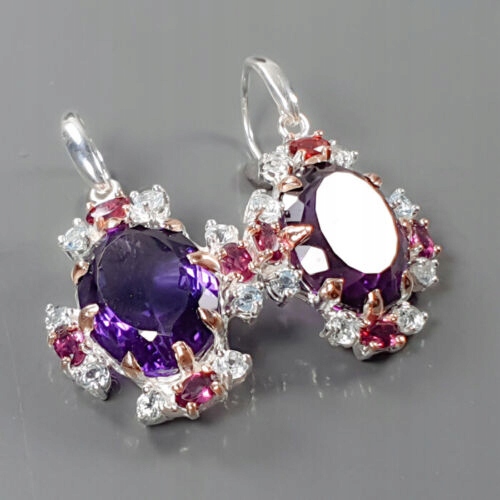 Oferujemy Państwu nowe, pozłacane różowym i białym złotem, srebrne - próba 925 kolczyki z naturalnymi AAA ametystami 40ct łącznie, granatami (rodolitami) i cyrkoniami.