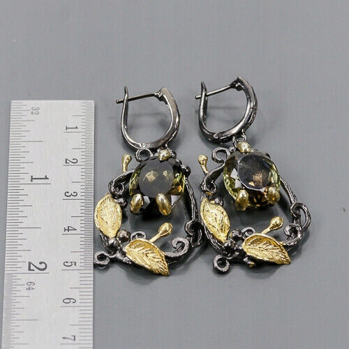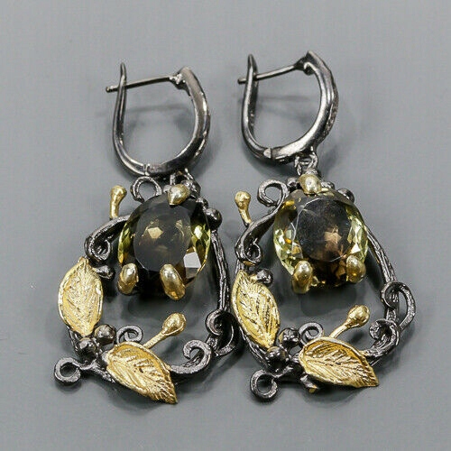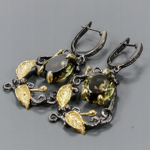 Oferujemy Państwu nowe, pozłacane żółtym złotem i pokryte czarnym rodem, srebrne - próba 925 kolczyki z naturalnymi cytrynowymi kwarcami.