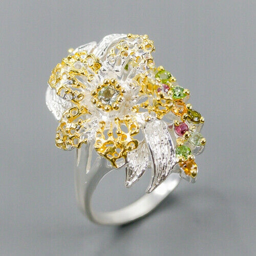 Oferujemy Państwu nowy, pozłacany białym i żółtym złotem, srebrny - próba 925 pierścionek z naturalnym iolitem i turmalinami.