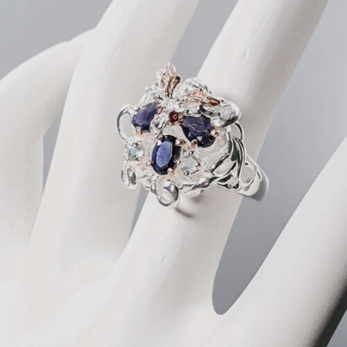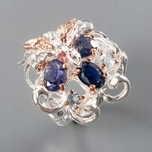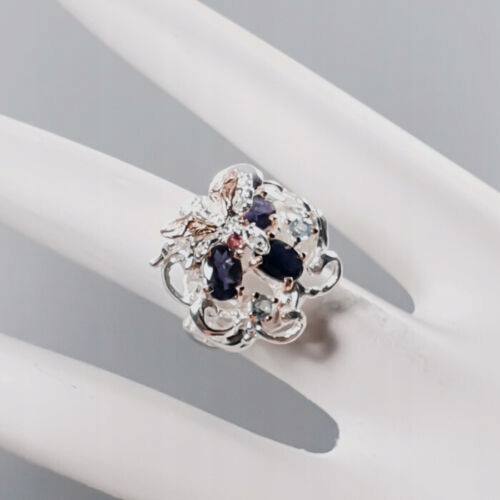 Oferujemy Państwu nowy, pozłacany różowym i białym złotem, srebrny - próba 925 pierścionek z naturalnymi iolitami, topazami i granatami (rodolitami).
