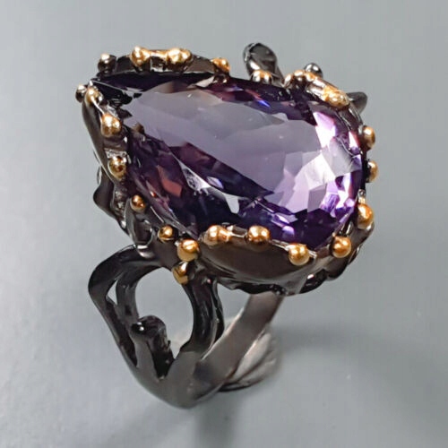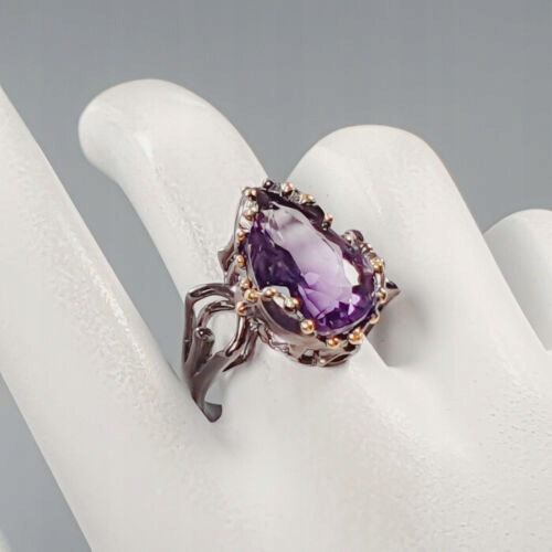 Oferujemy Państwu nowy, pozłacany żółtym złotem i pokryty czarnym rodem, srebrny - próba 925 pierścionek z naturalnym ametystem IF AAA.