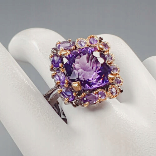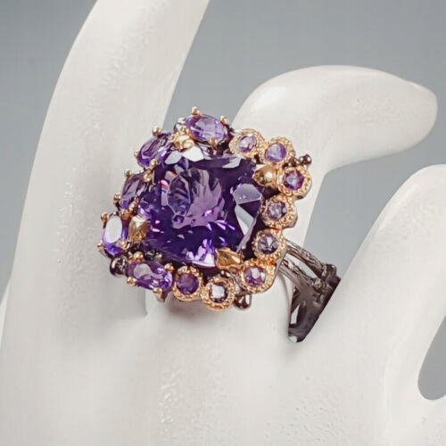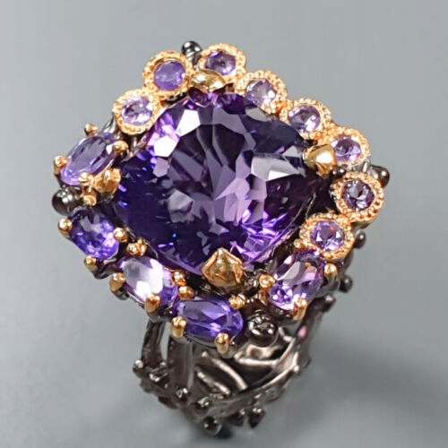 Oferujemy Państwu nowy, pozłacany żółtym złotem i pokryty czarnym rodem, srebrny - próba 925 pierścionek z naturalnymi ametystami.