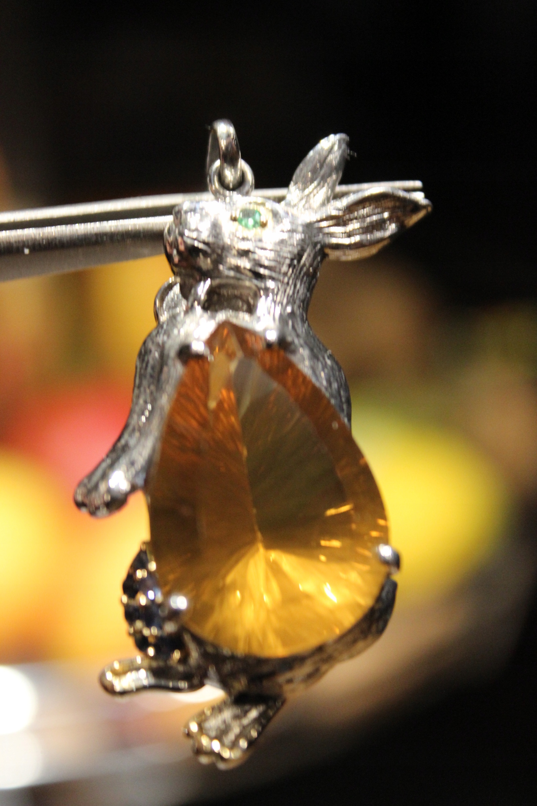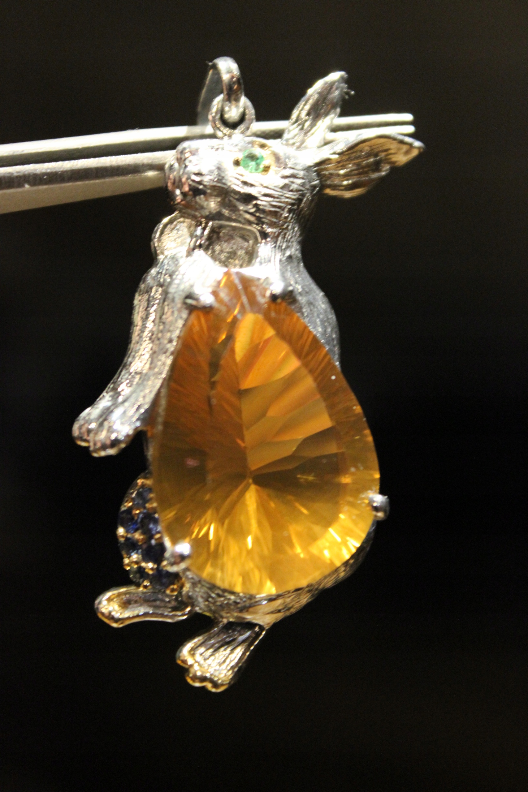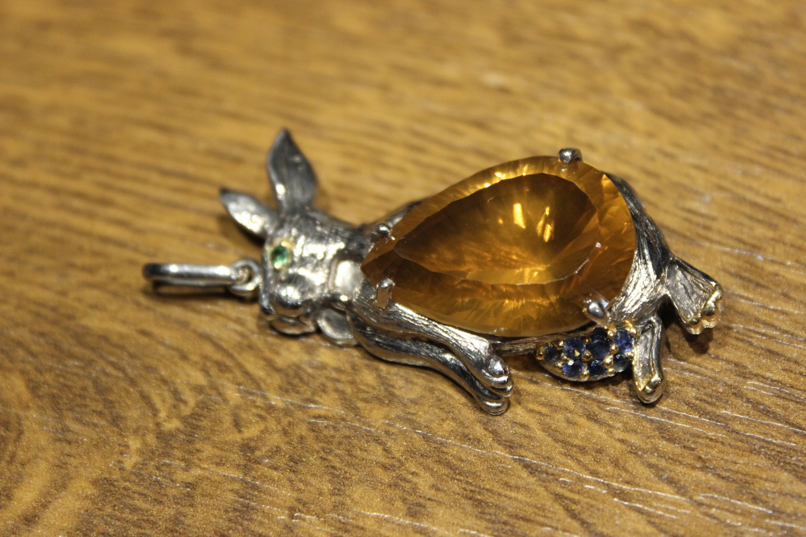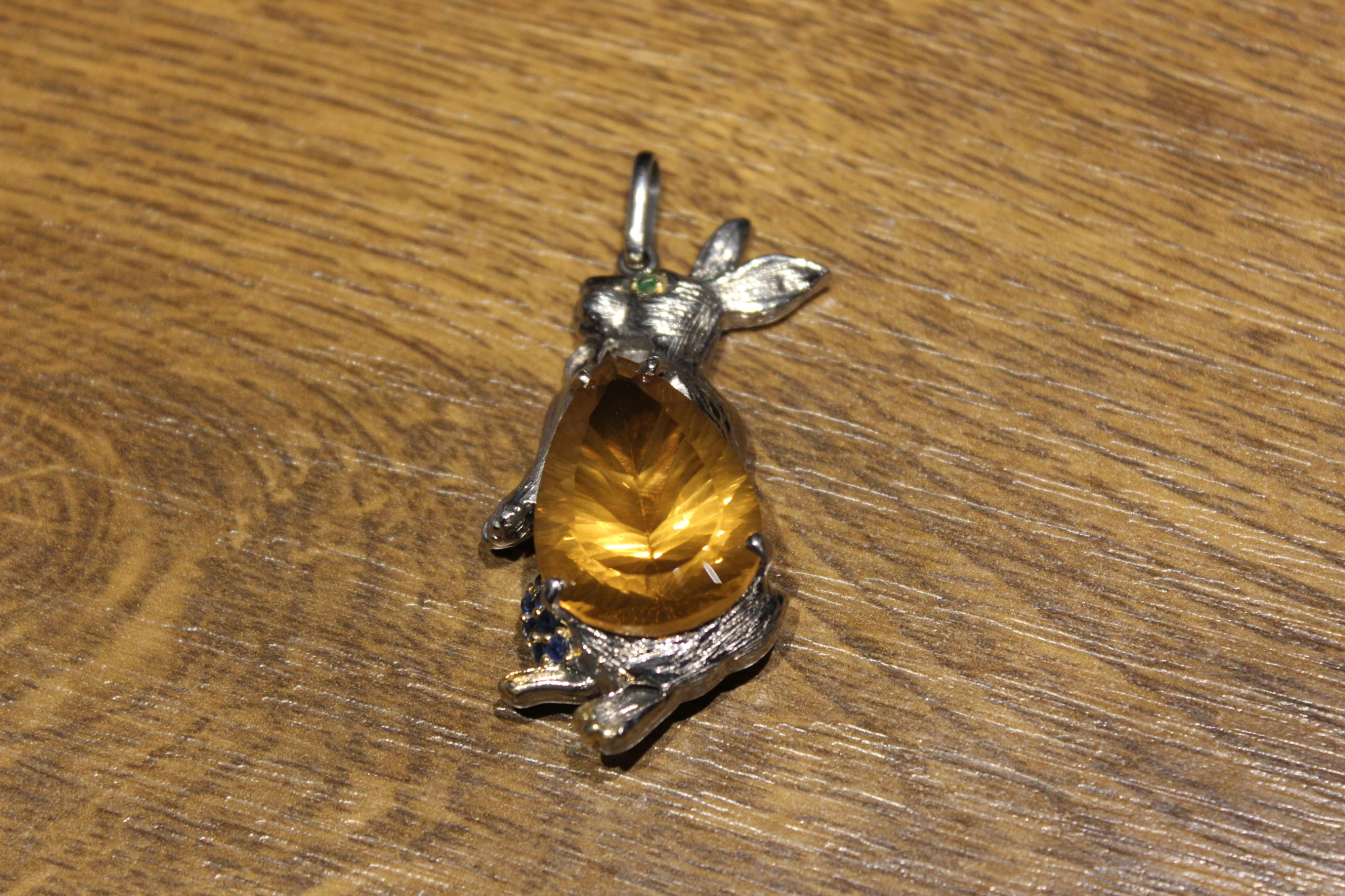 Artystyczny wisiorek srebrny cytryn szafiry królik