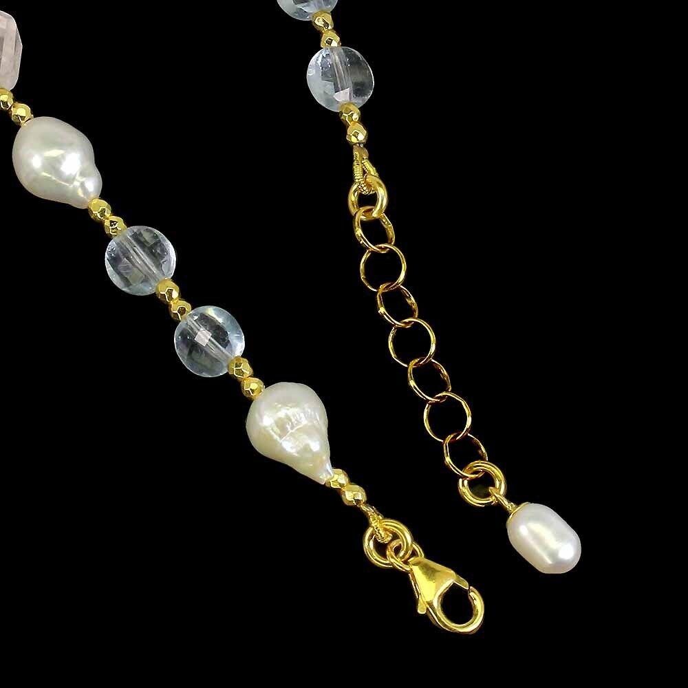 Oferujemy Państwu nową, pozłacaną żółtym złotem 14K, srebrną - próba 925 bransoletkę z naturalnymi ametystami, kwarcem różowym, akwamarynami i perłami.