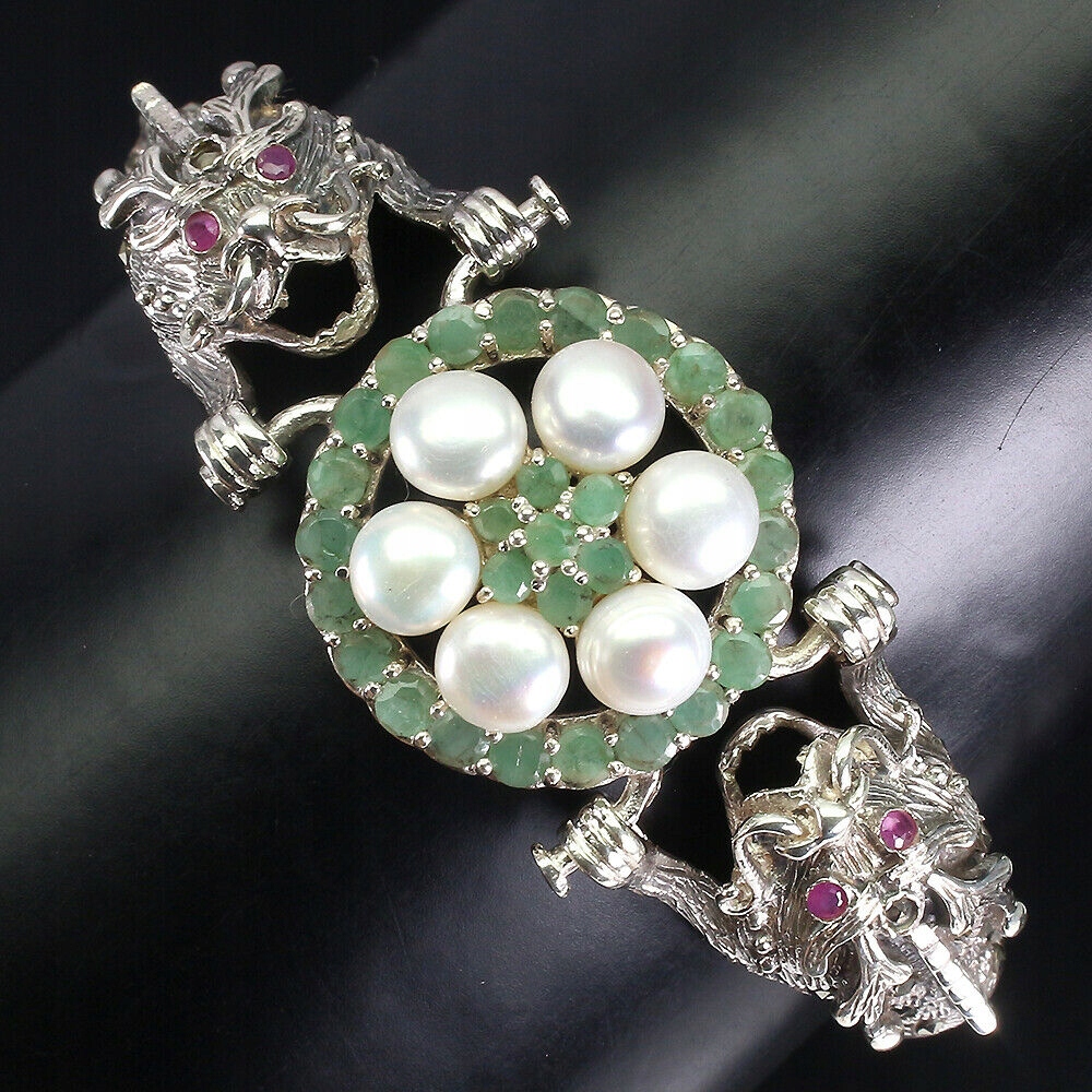 Oferujemy Państwu nową, srebrną - próba 925 bransoletę z naturalnymi perłami, rubinami, markazytami i szmaragdami.