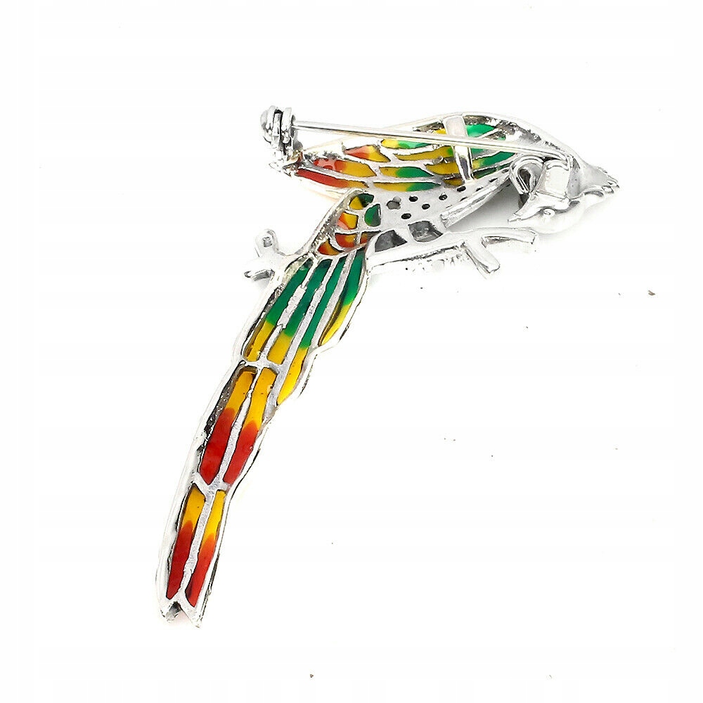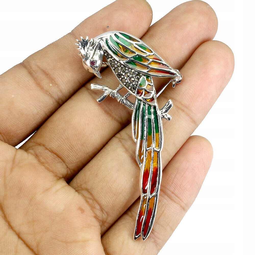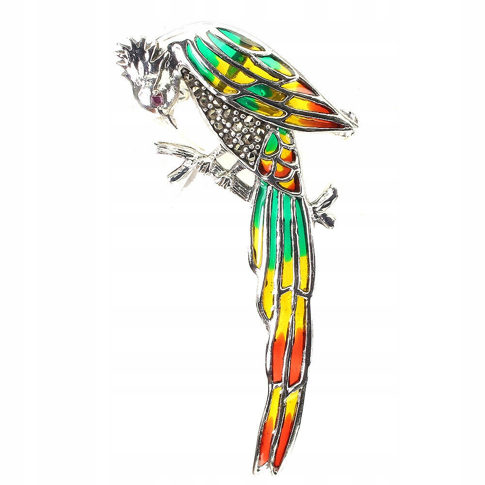 Broszka emaliowana srebro rubiny markazyty ptak