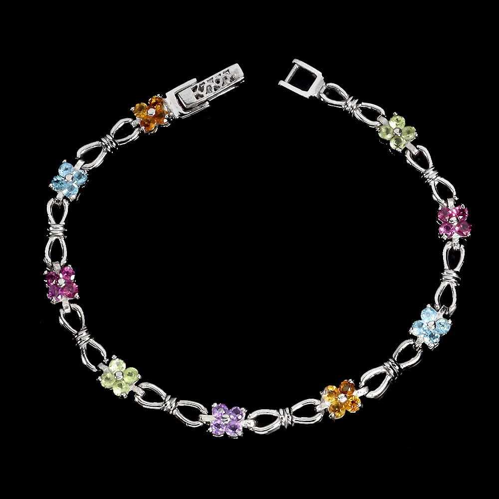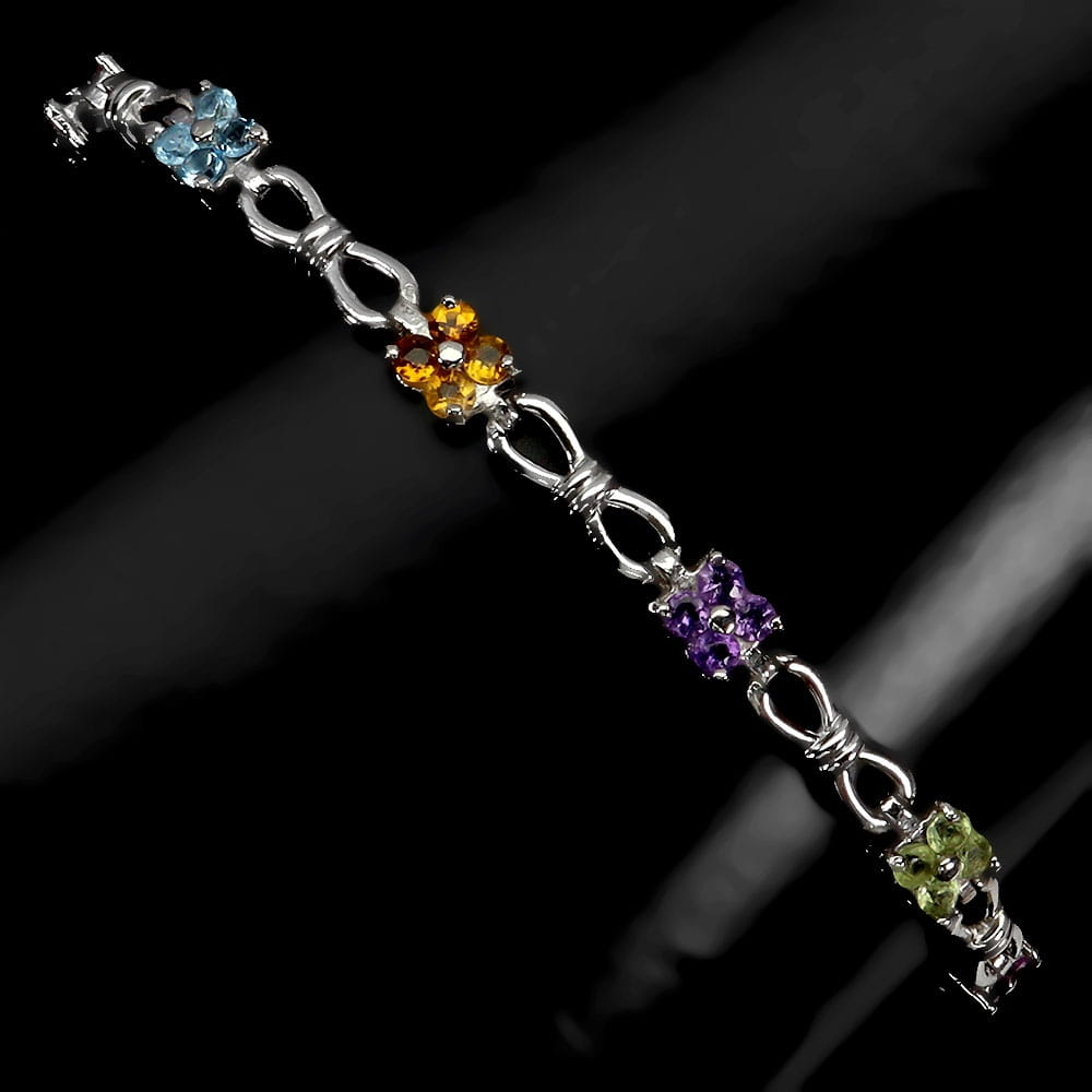 Oferujemy Państwu pozłacaną białym złotem 14K, srebrną - próba 925 - bransoletkę z naturalnymi sky blue topazami, ametystami, cytrynami, granatami (rodolitami) i oliwinami.