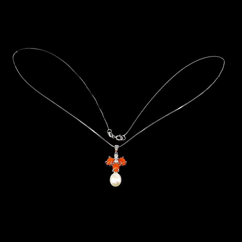 Oferujemy Państwu nowy, pozłacany 14K białym złotem, srebrny - próba 925 naszyjnik z naturalnymi pomarańczowymi opalami, masą perłową i cyrkoniami.