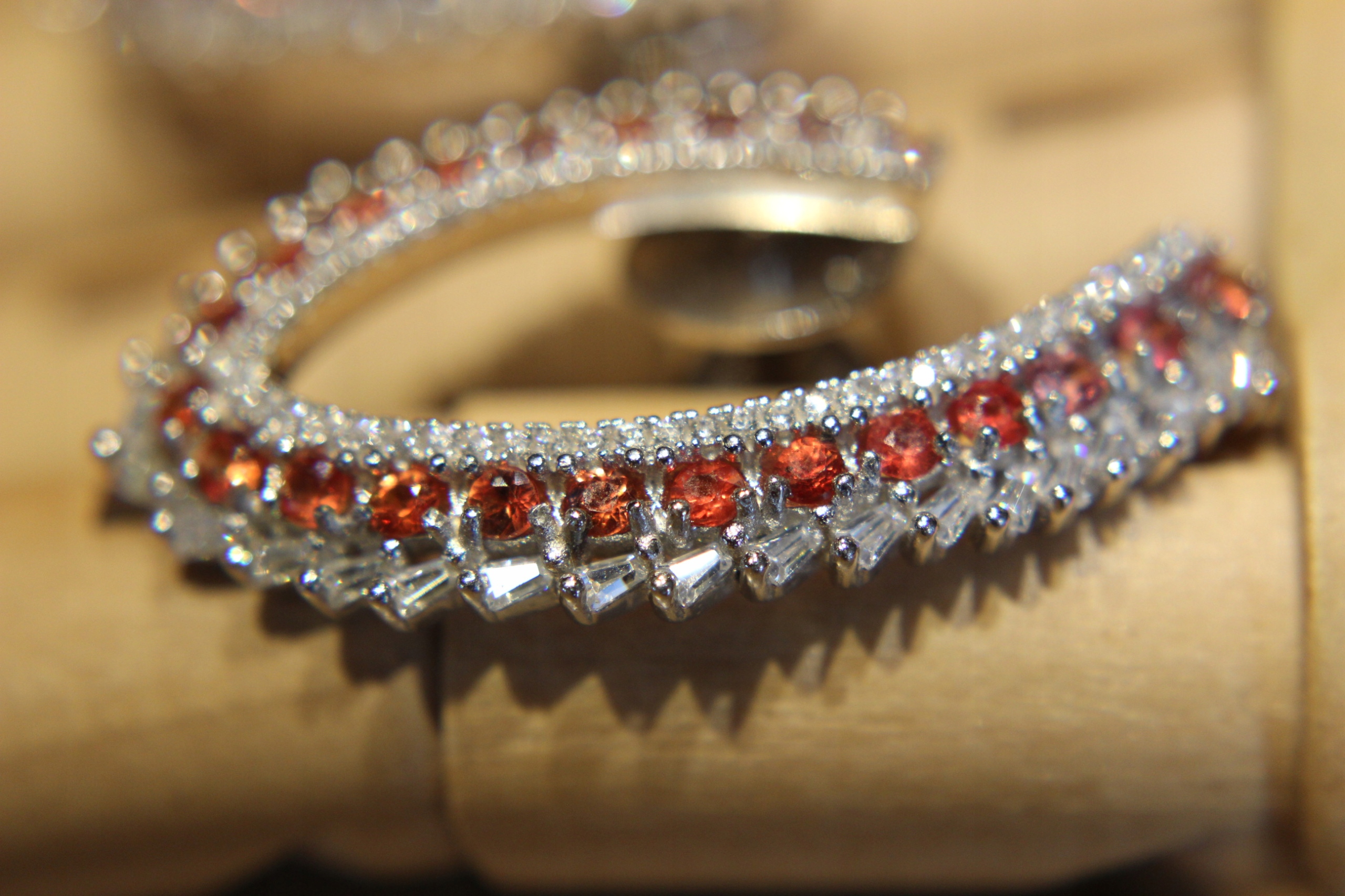 Oferujemy Państwu nowe, pozłacane białym złotem 14K, srebrne - próba 925 kolczyki z naturalnymi szafirami Songea padparadża pomarańczowymi i cyrkoniami.
