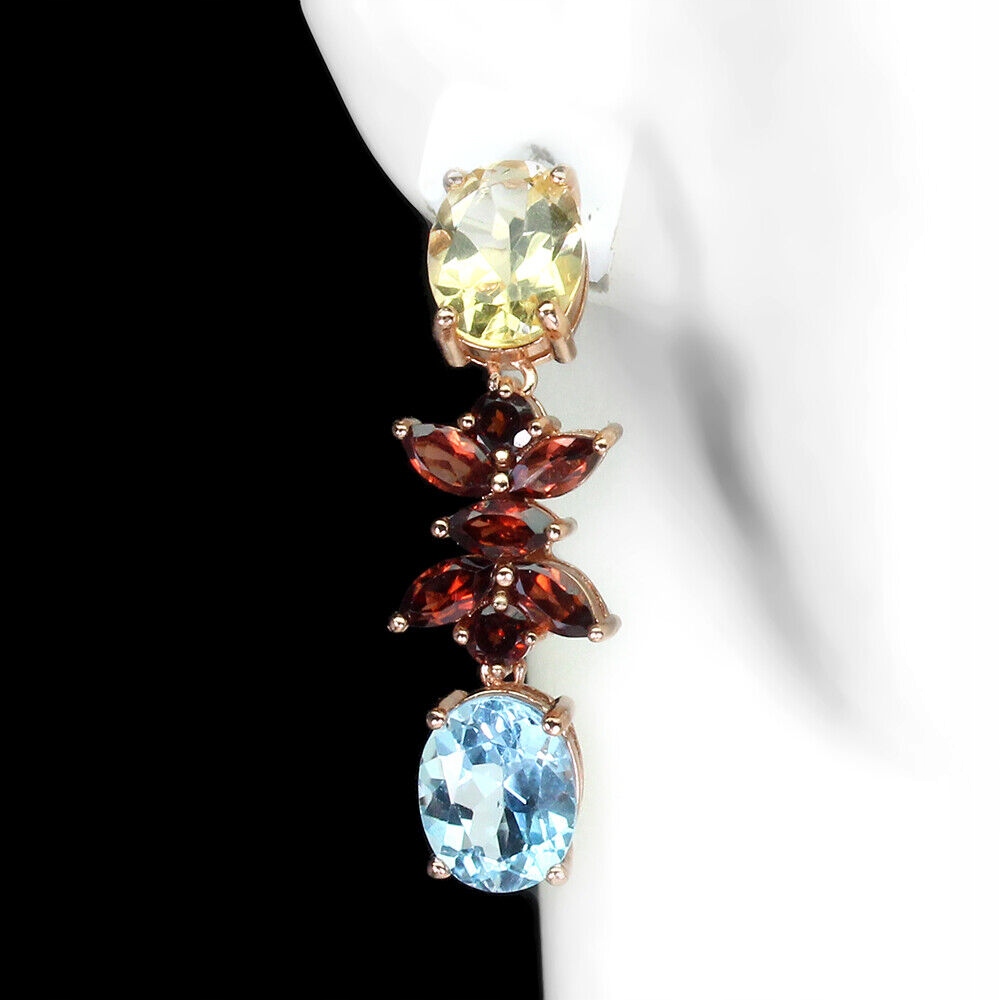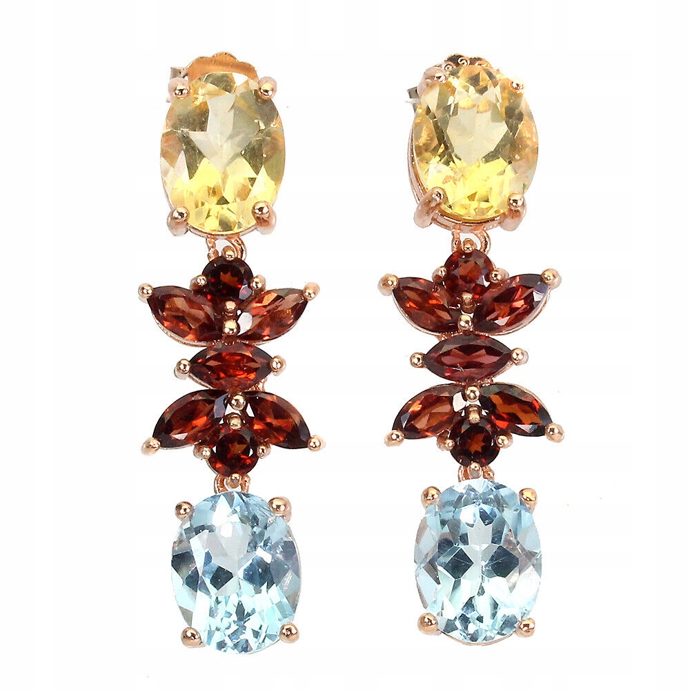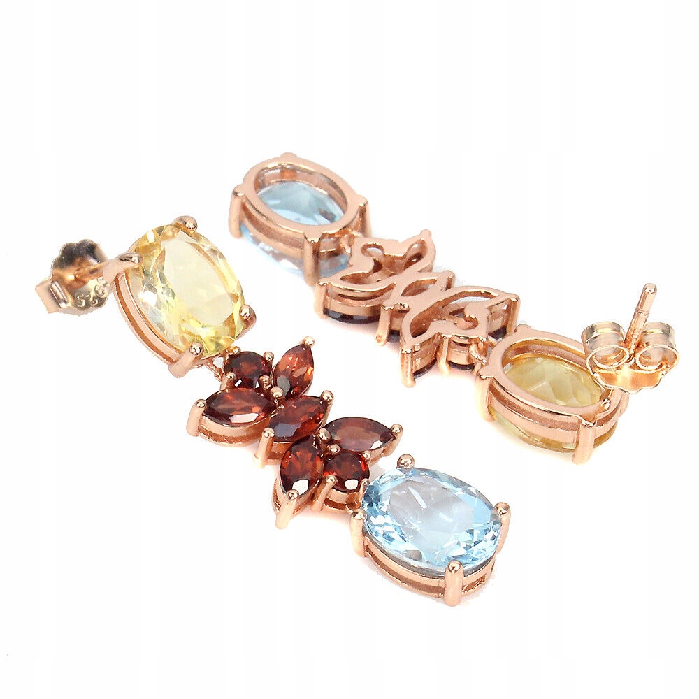 Oferujemy Państwu nowe, pozłacane różowym złotem 14K, srebrne - próba 925 kolczyki z naturalnymi topazami sky blue, cytrynami i granatami.
