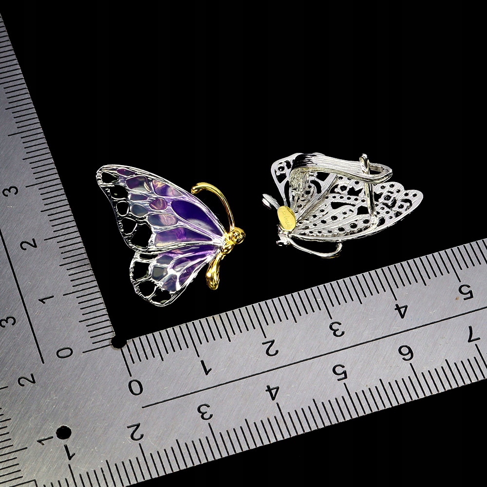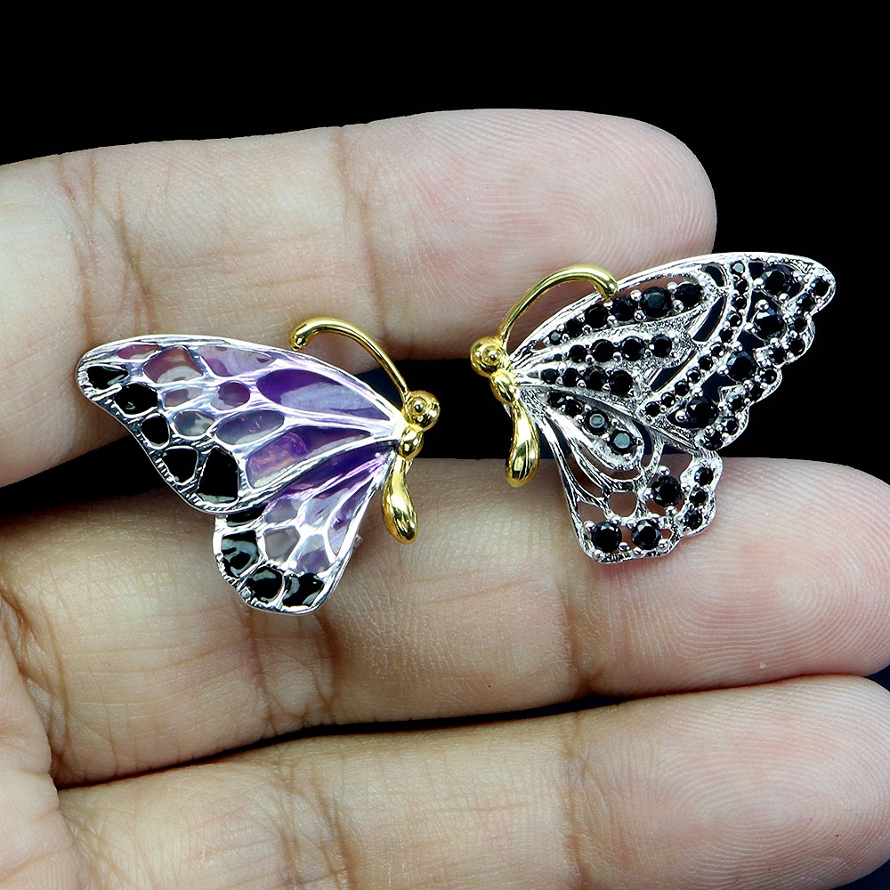 Kolczyki srebrne zjawiskowe emaliowane motyle naturalne czarne spinele 5