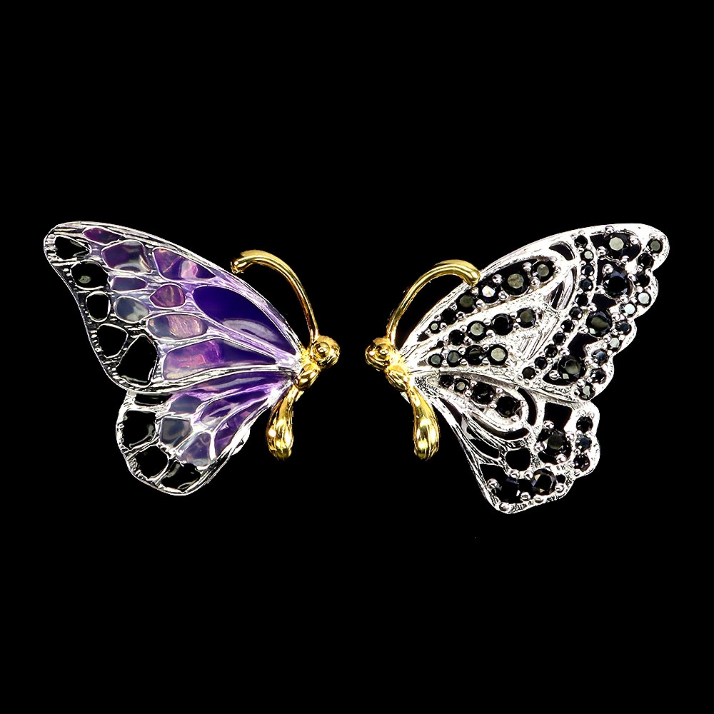 Oferujemy Państwu pozłacane białym i żółtym 14K złotem, srebrne - próba 925 - emaliowane kolczyki motyle z naturalnymi czarnymi spinelami.