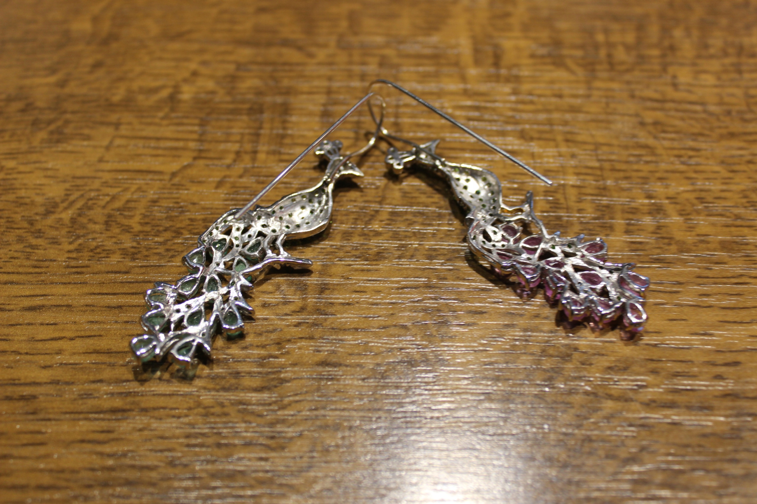 oferujemy Państwu nowe, pozłacane białym i żółtym 14K złotem srebrne - próba 925 kolczyki z naturalnymi szafirami, szmaragdami i diopsydami. Proszę zwrócić uwagę podczas zakupu, że pawie mają główki w jedną stronę. Kolczyki są zrobione na zamówione przez złotnika z dwóch broszek. Były fantazyjnym pomysłem na bajkowe kolczyki z dwoma różnymi pawiami wysadzanymi różniącymi się kolorystycznie kamieniami. Są piękne, okazałe, dla Pani, która lubi niecodzienne pomysły i nie boi się ekstrawagancji. Mają też sporą ilość cennych kamieni.