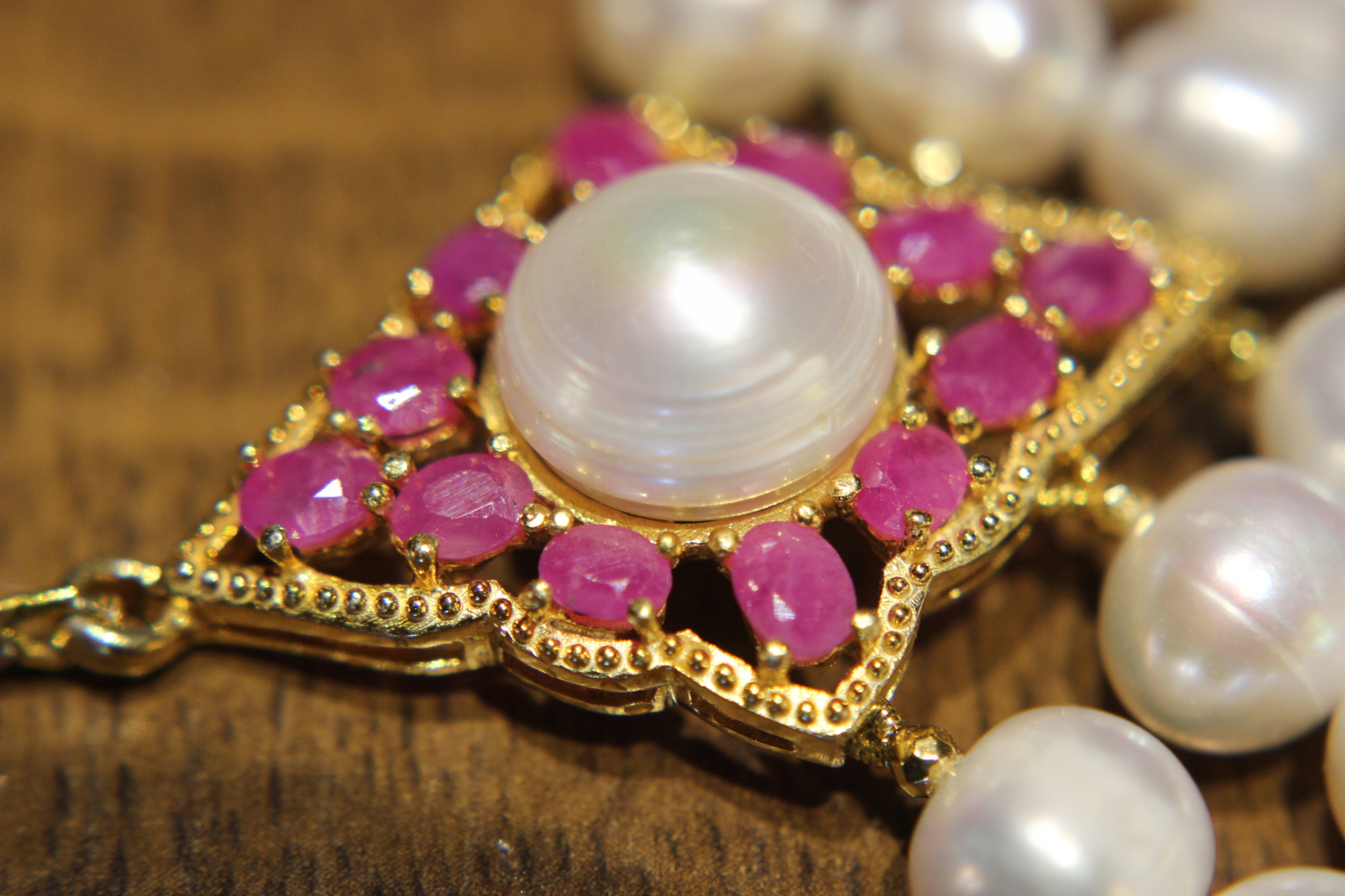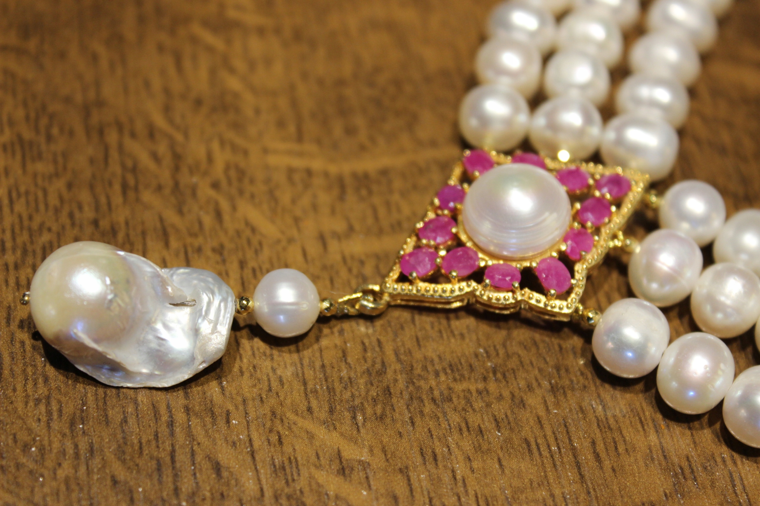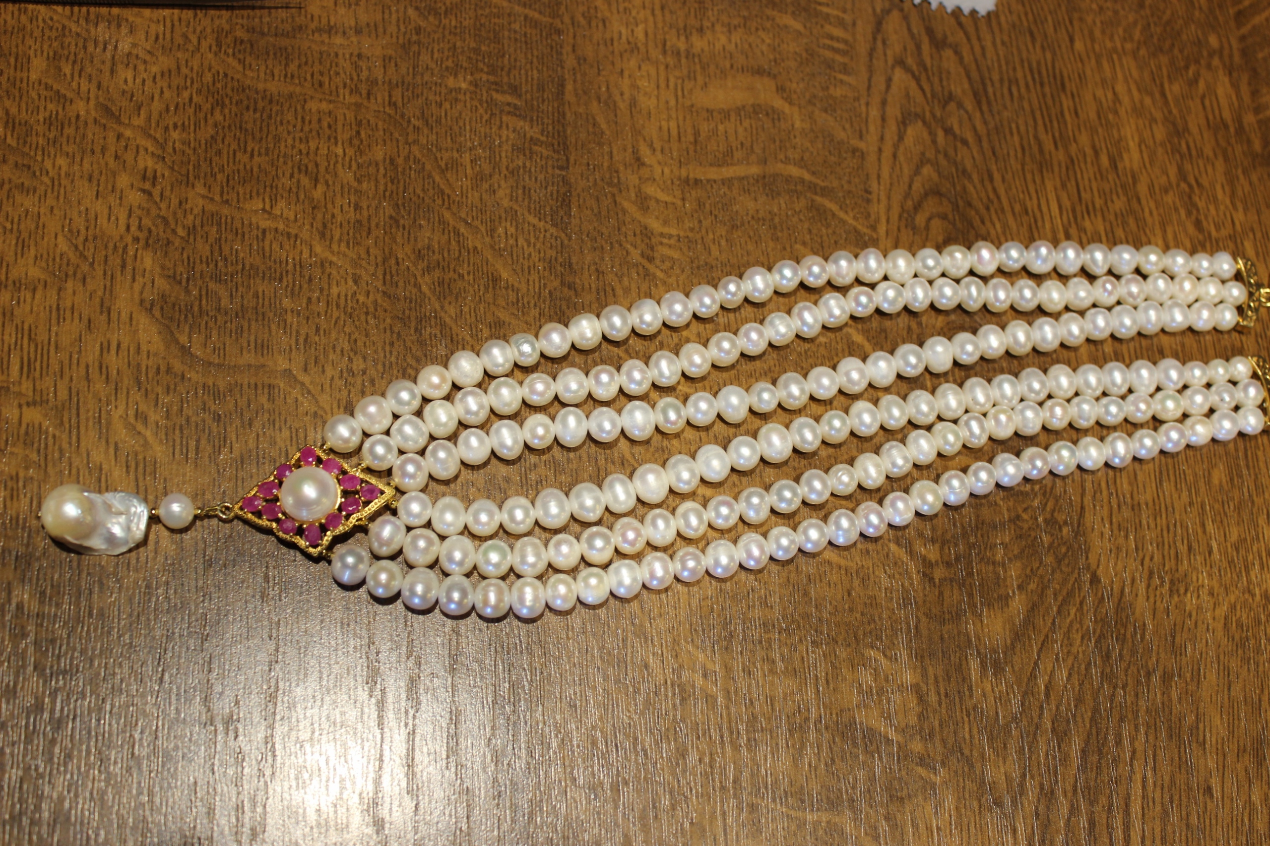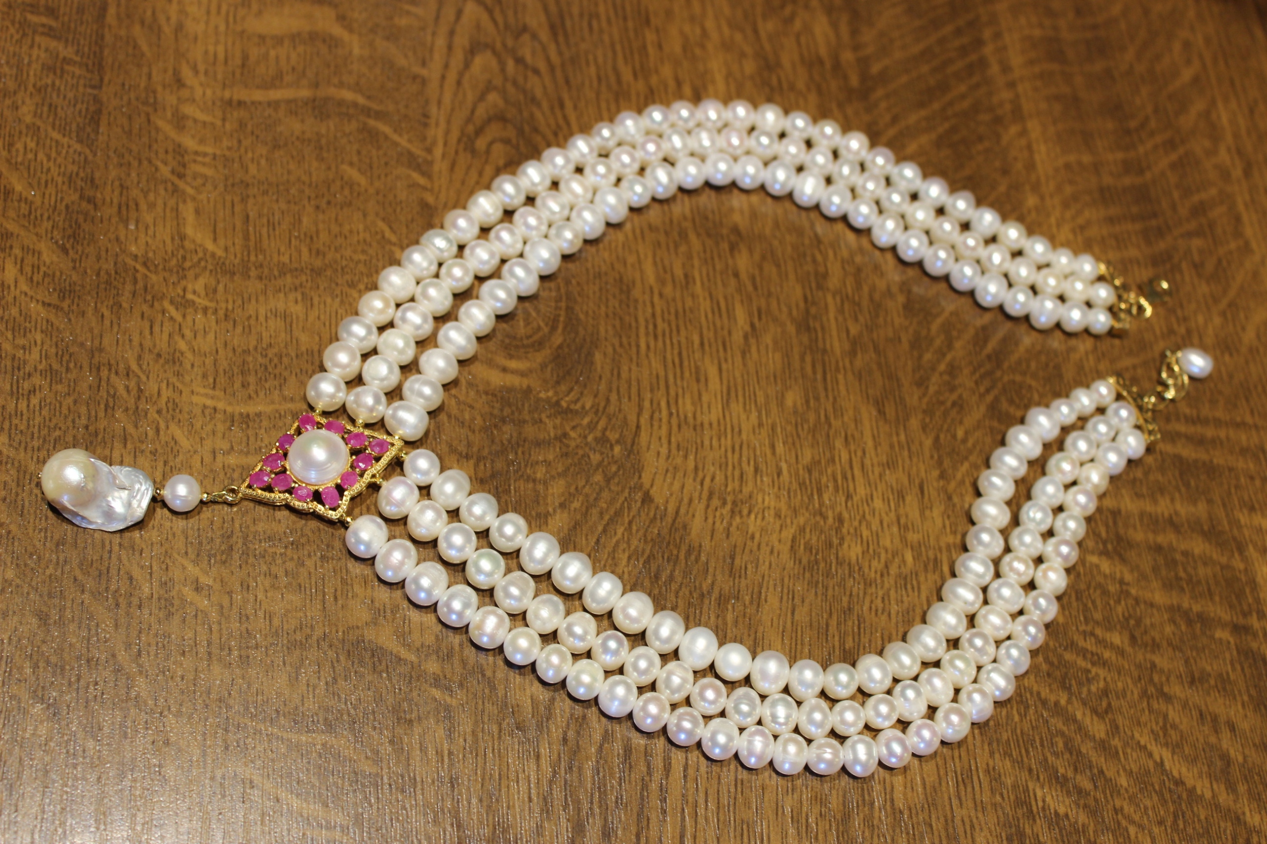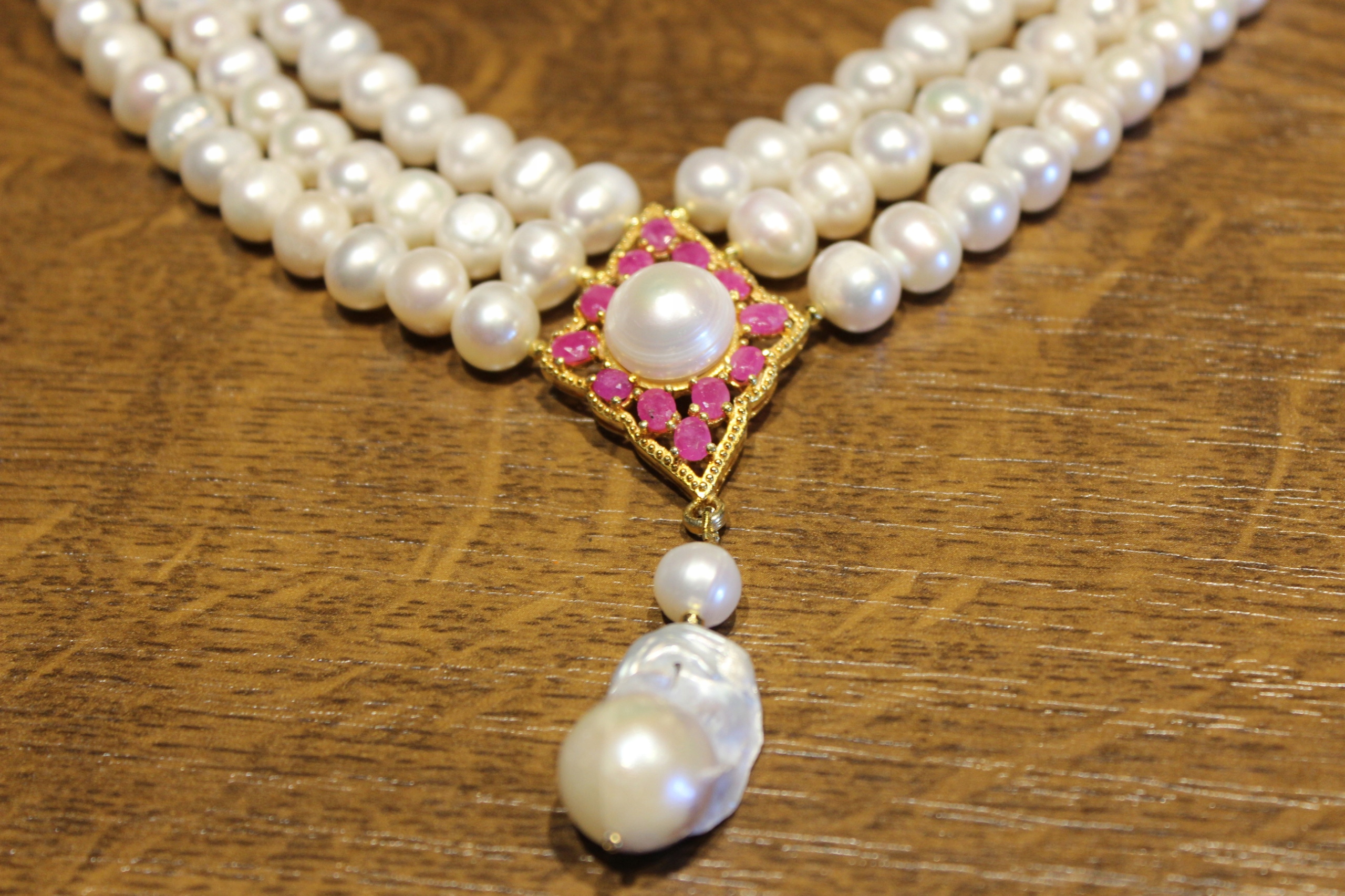 Oferujemy Państwu nowy, pozłacany 14K żółtym złotem, srebrny - próba 925 naszyjnik z naturalnymi perłami i rubinami.