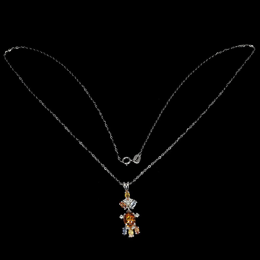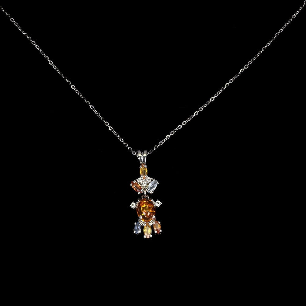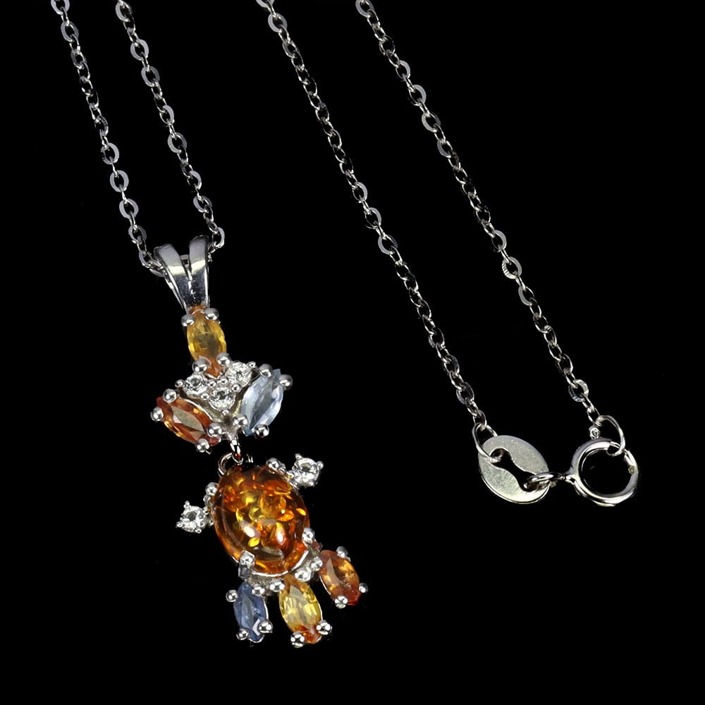 Oferujemy Państwu nowy, pozłacany 14K białym złotem, srebrny - próba 925 naszyjnik z naturalnym bursztynem, szafirami Songea i cyrkoniami.
