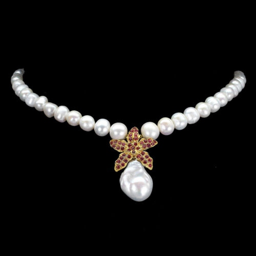 Piękny naszyjnik naturalne rubiny perły 925 kwiat