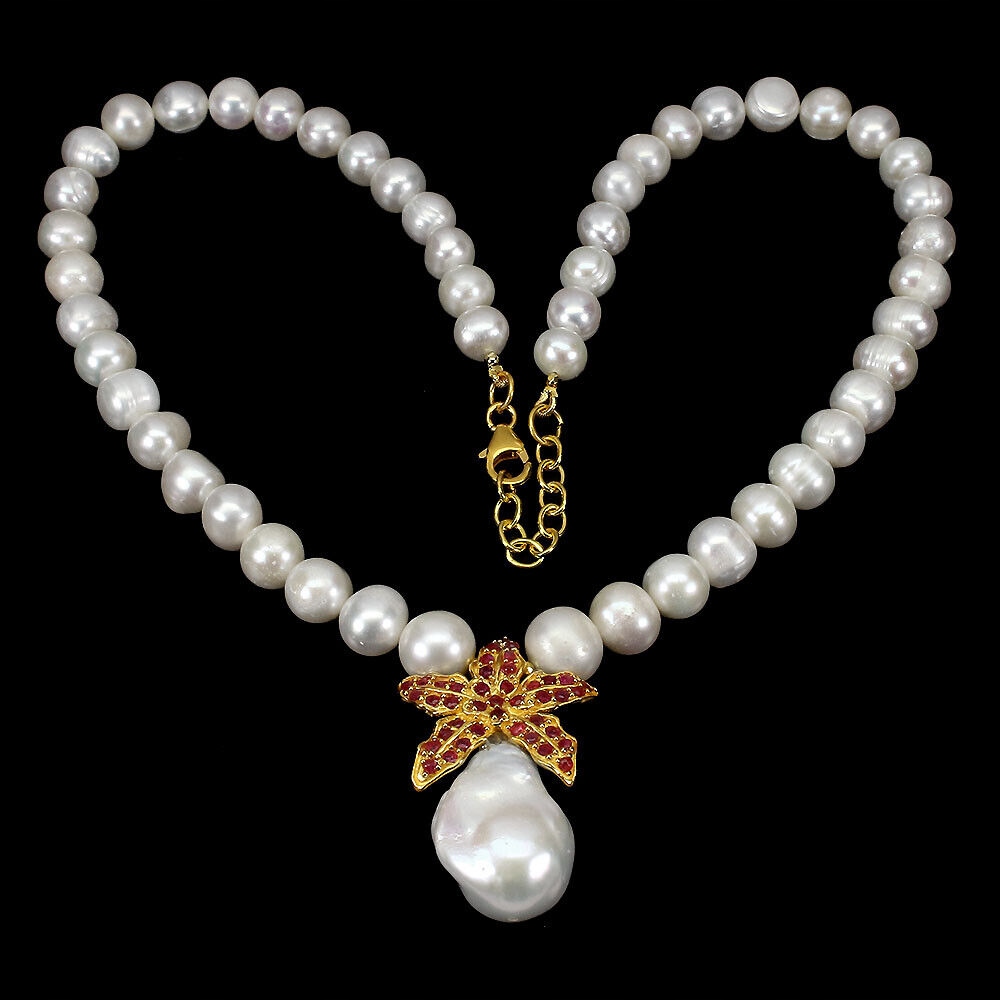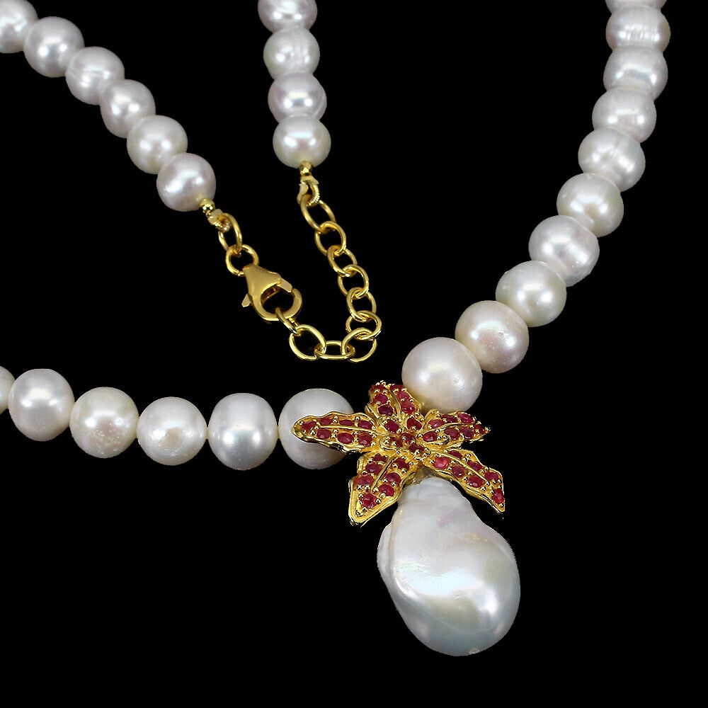 Oferujemy Państwu nowy, pozłacany 14K żółtym złotem, srebrny - próba 925 naszyjnik z naturalnymi perłami i rubinami.