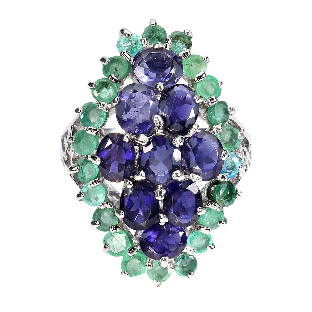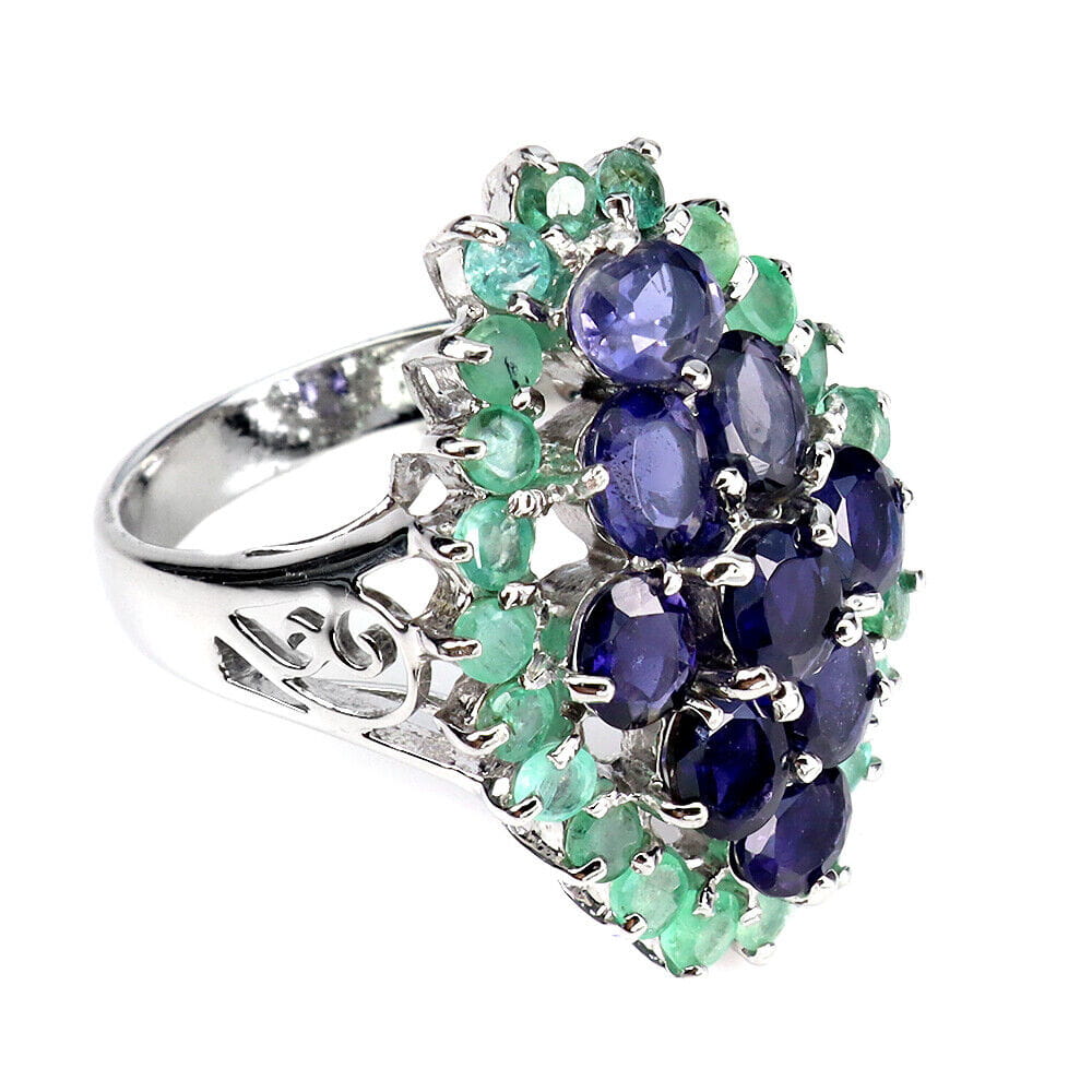 Oferujemy Państwu nowy, pozłacany białym złotem 14K, srebrny - próba 925 pierścionek z naturalnymi szmaragdami i iolitami.
