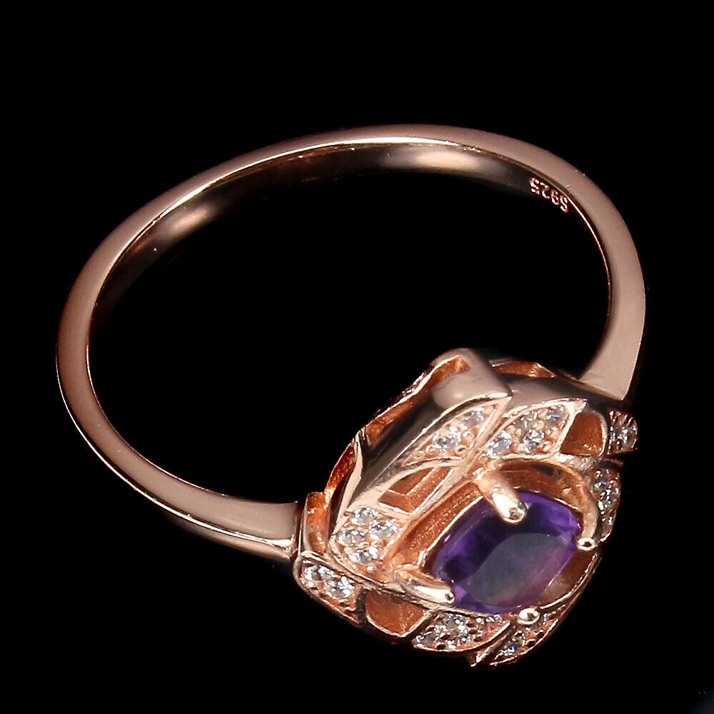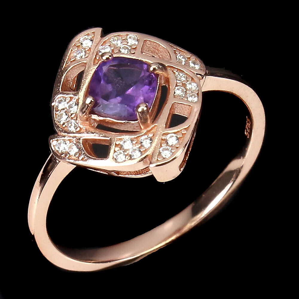 Oferujemy Państwu nowy, pozłacany różowym złotem 14K, srebrny - próba 925 pierścionek z naturalnym ametystem i cyrkoniami.
