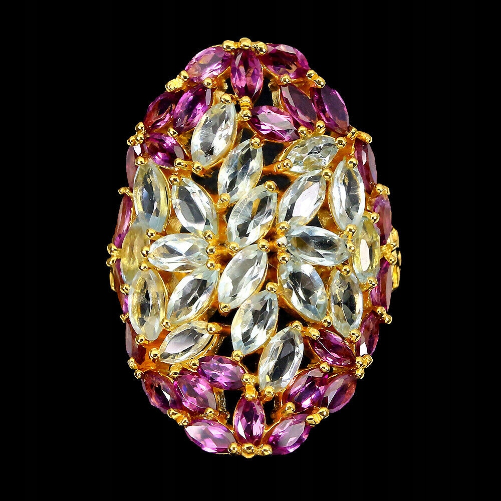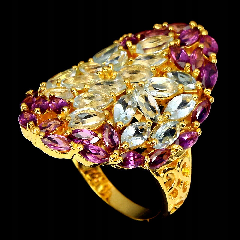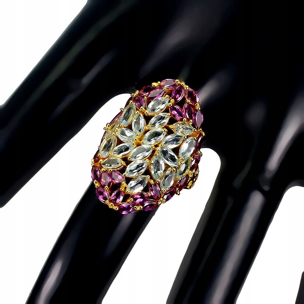 Oferujemy Państwu nowy, pozłacany 14K żółtym złotem, srebrny - próba 925 pierścionek z naturalnymi granatami (rodolitami) i akwamarynami.