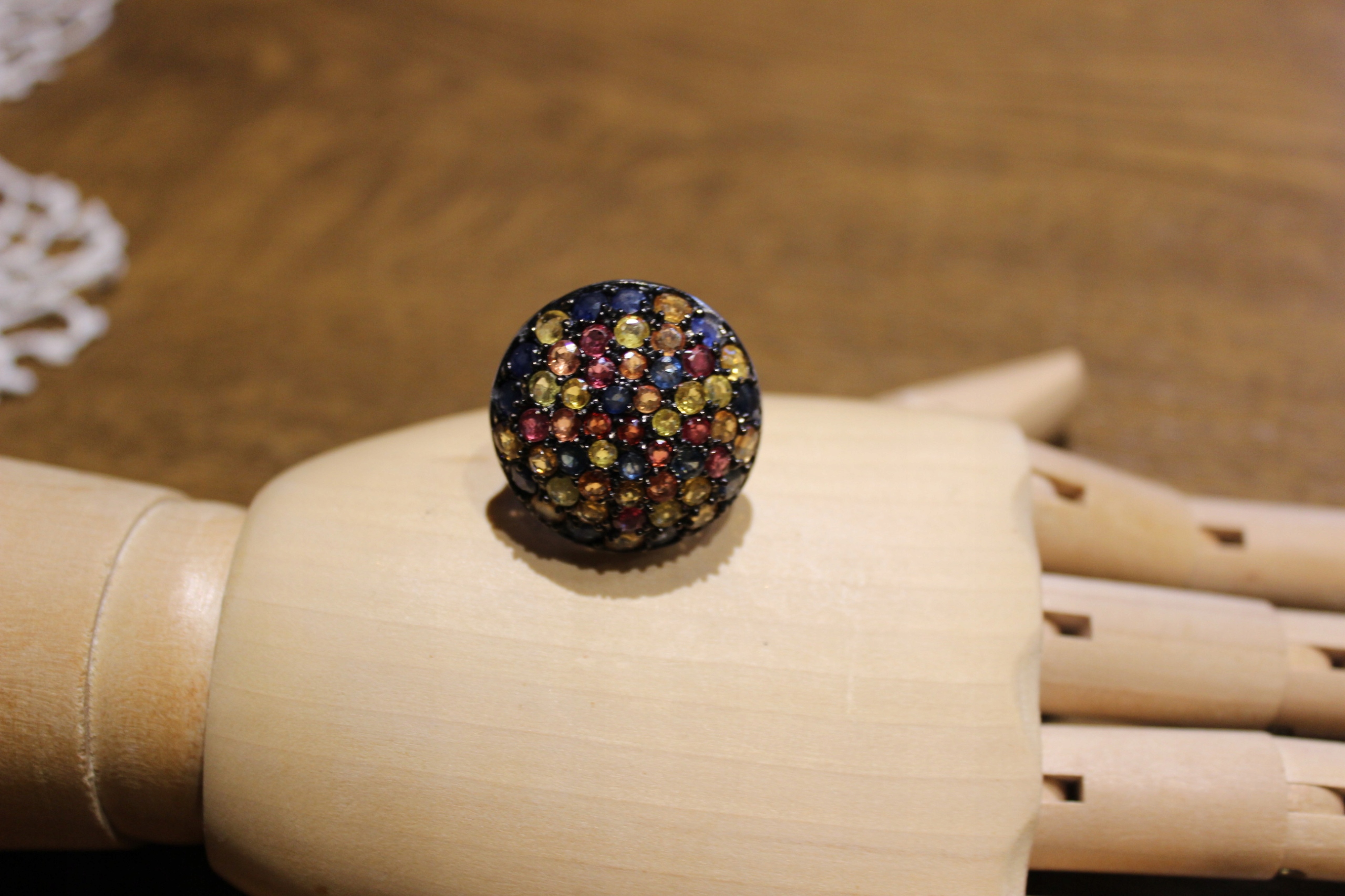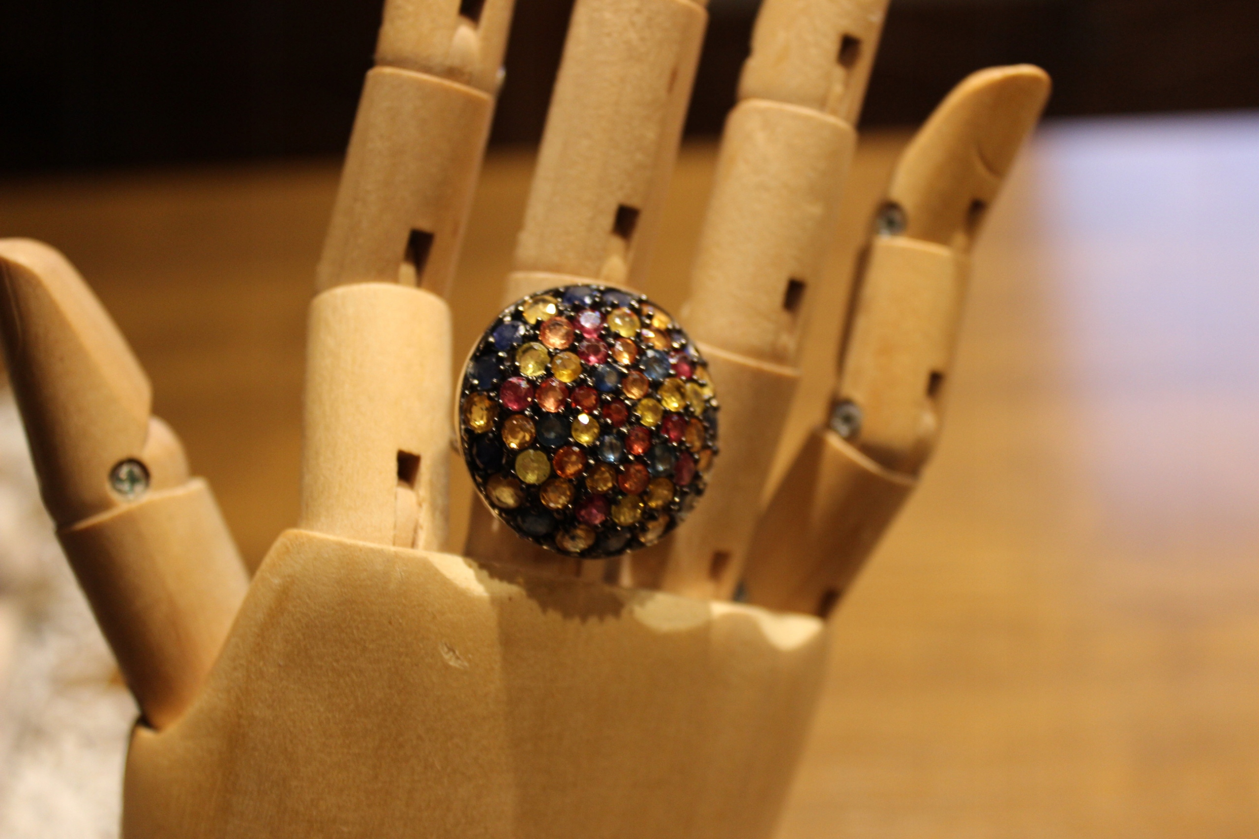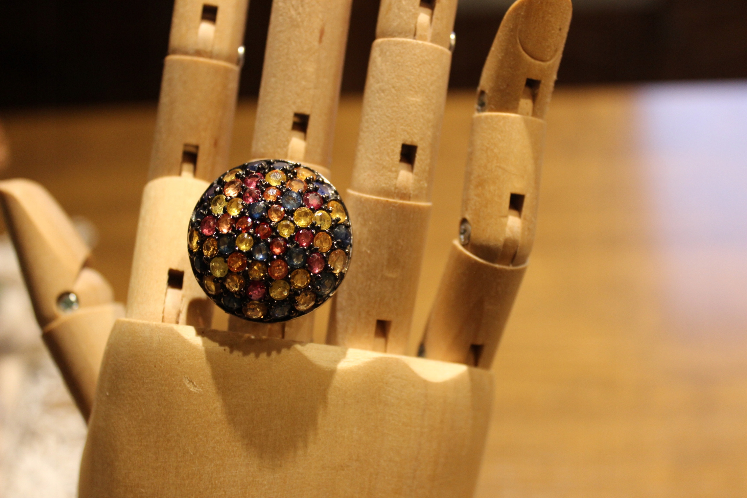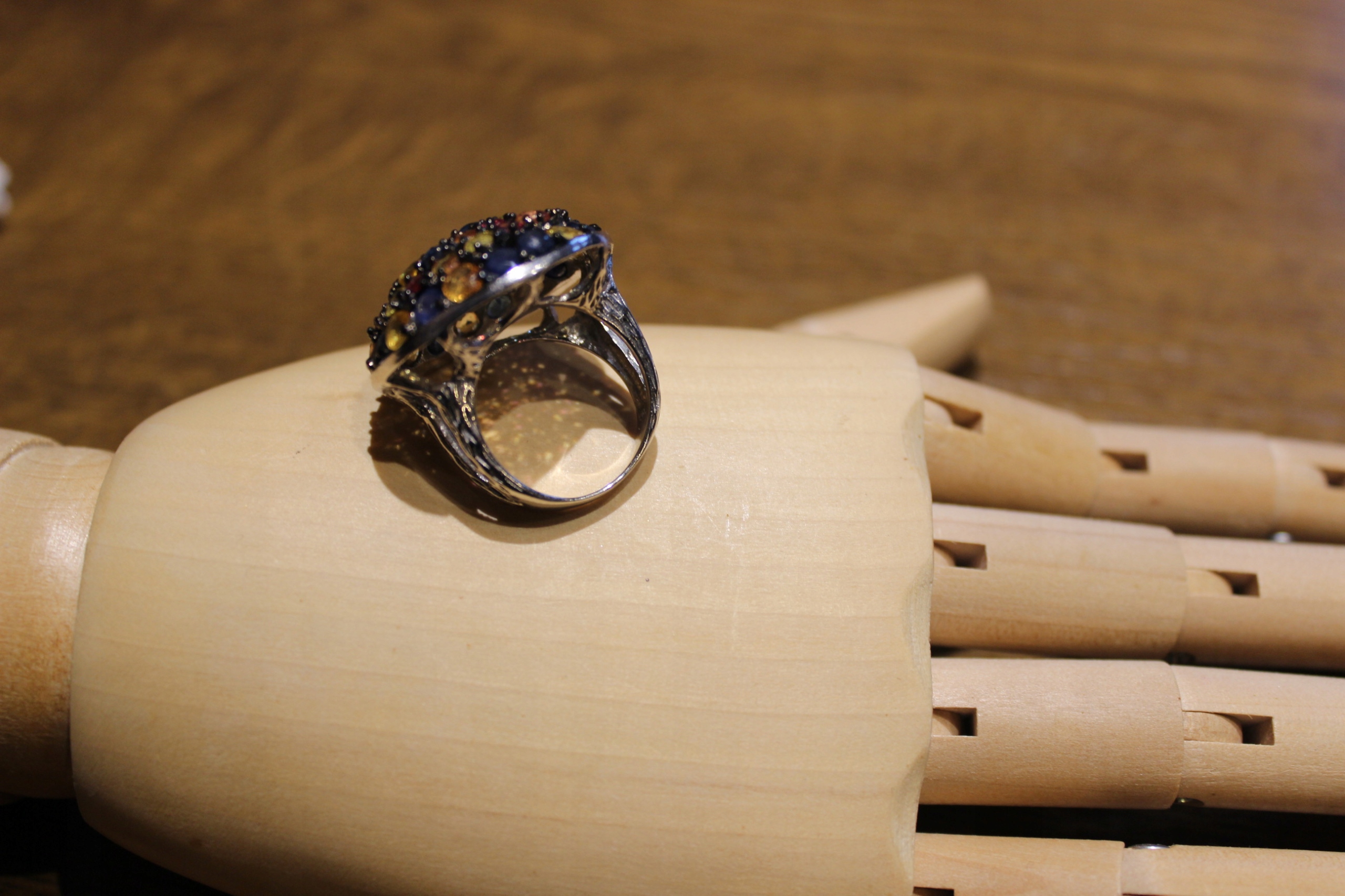 oferujemy Państwu nowy, pozłacany 14K białym złotem srebrny - próba 925 pierścionek z naturalnymi rubinami i szafirami.