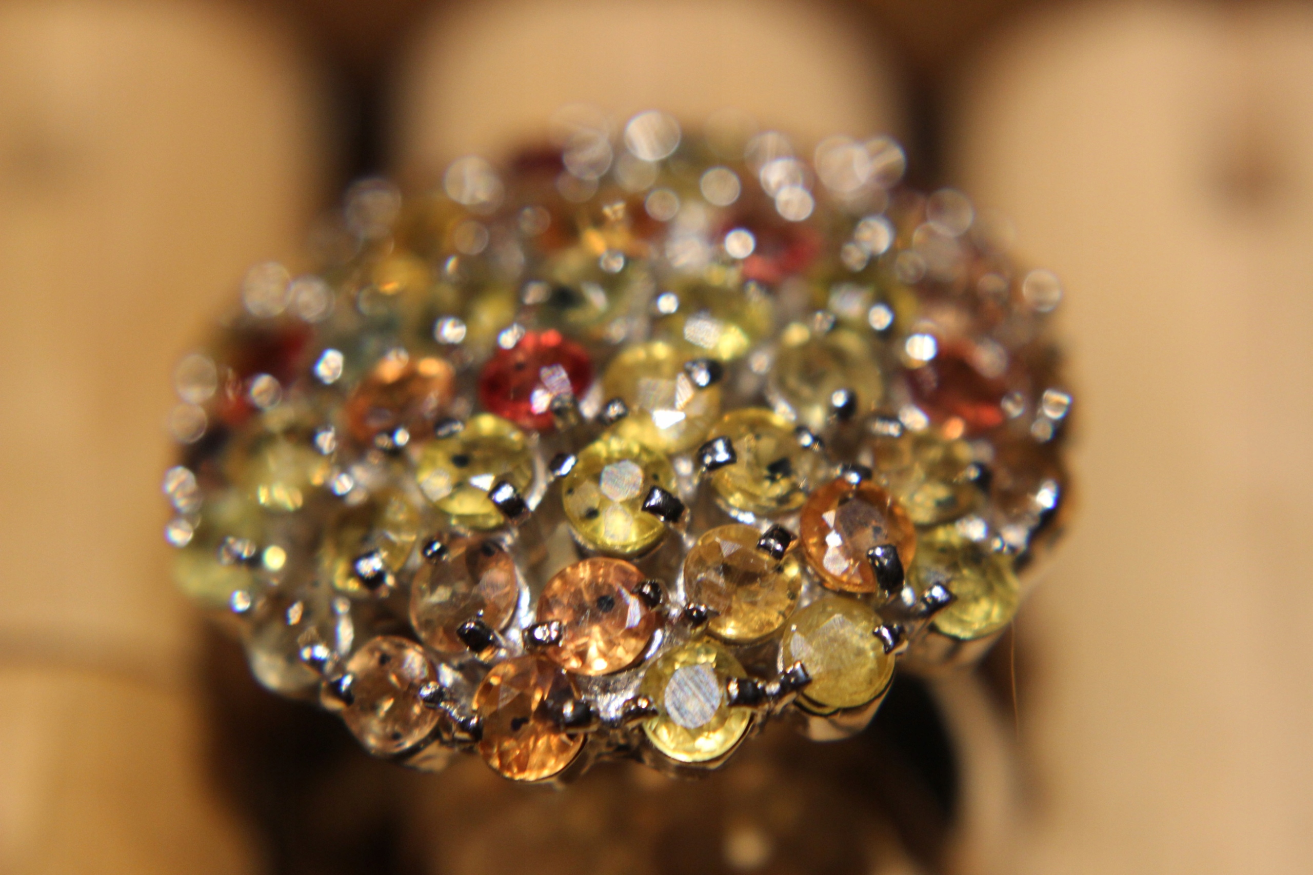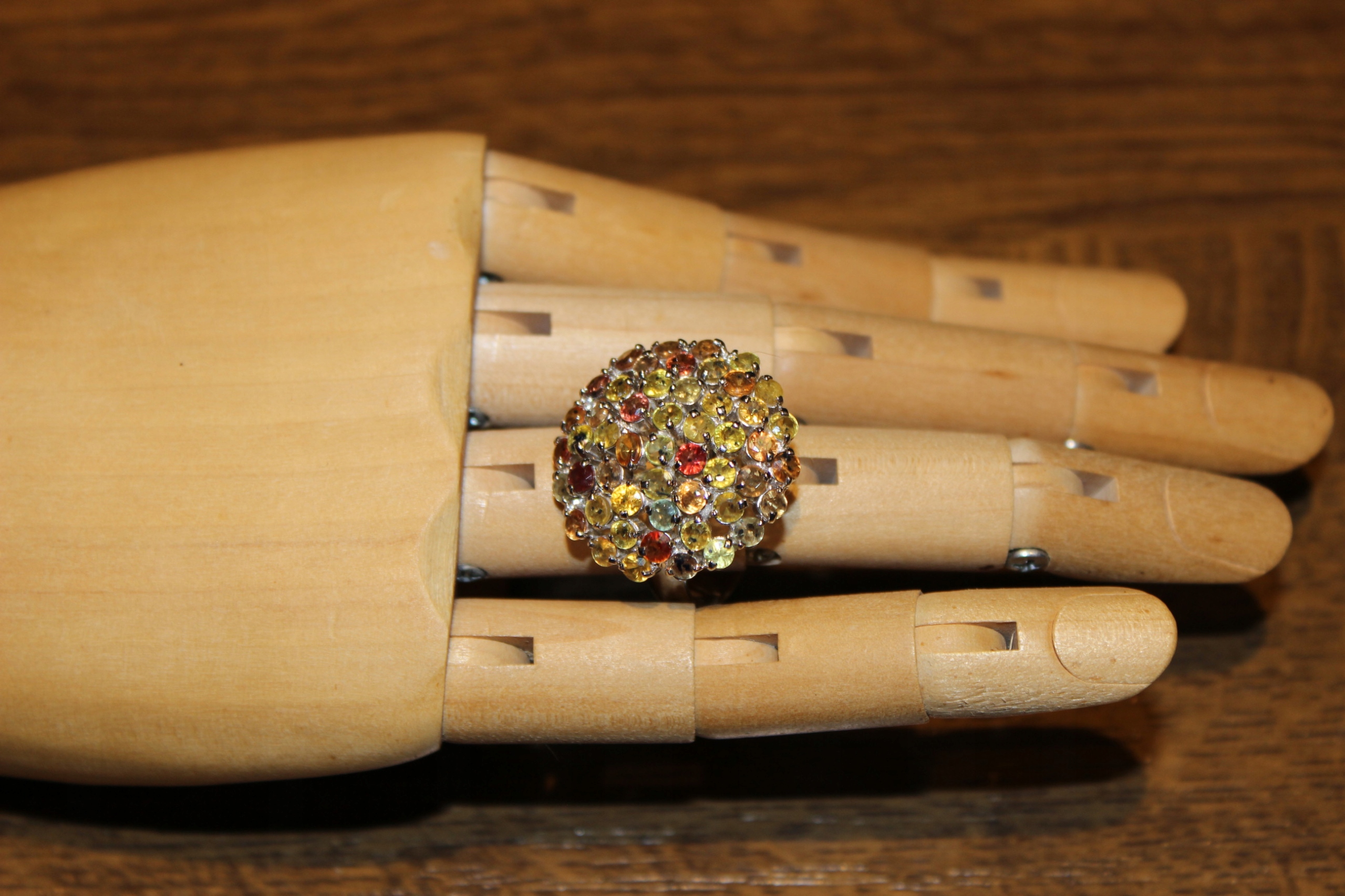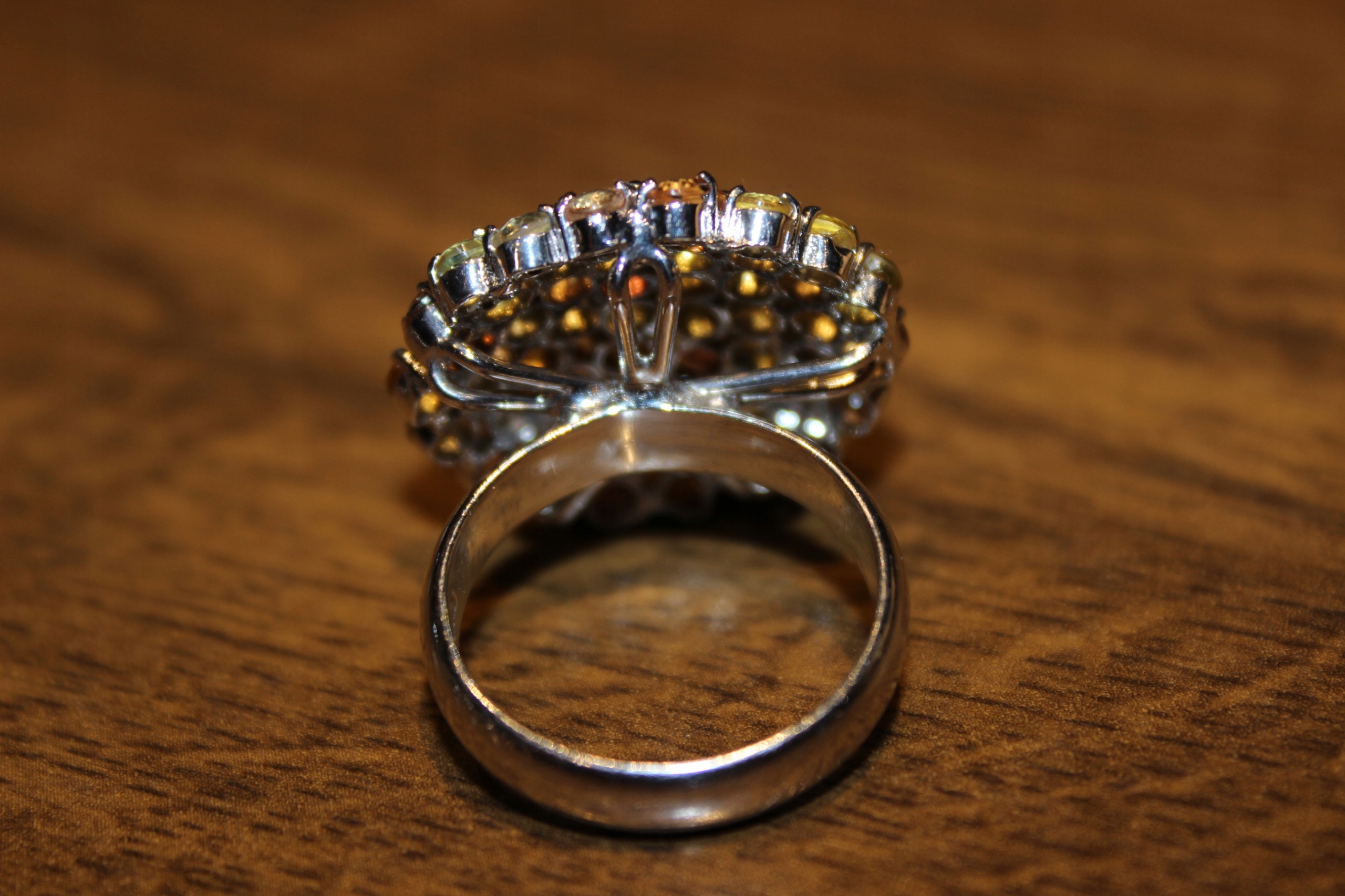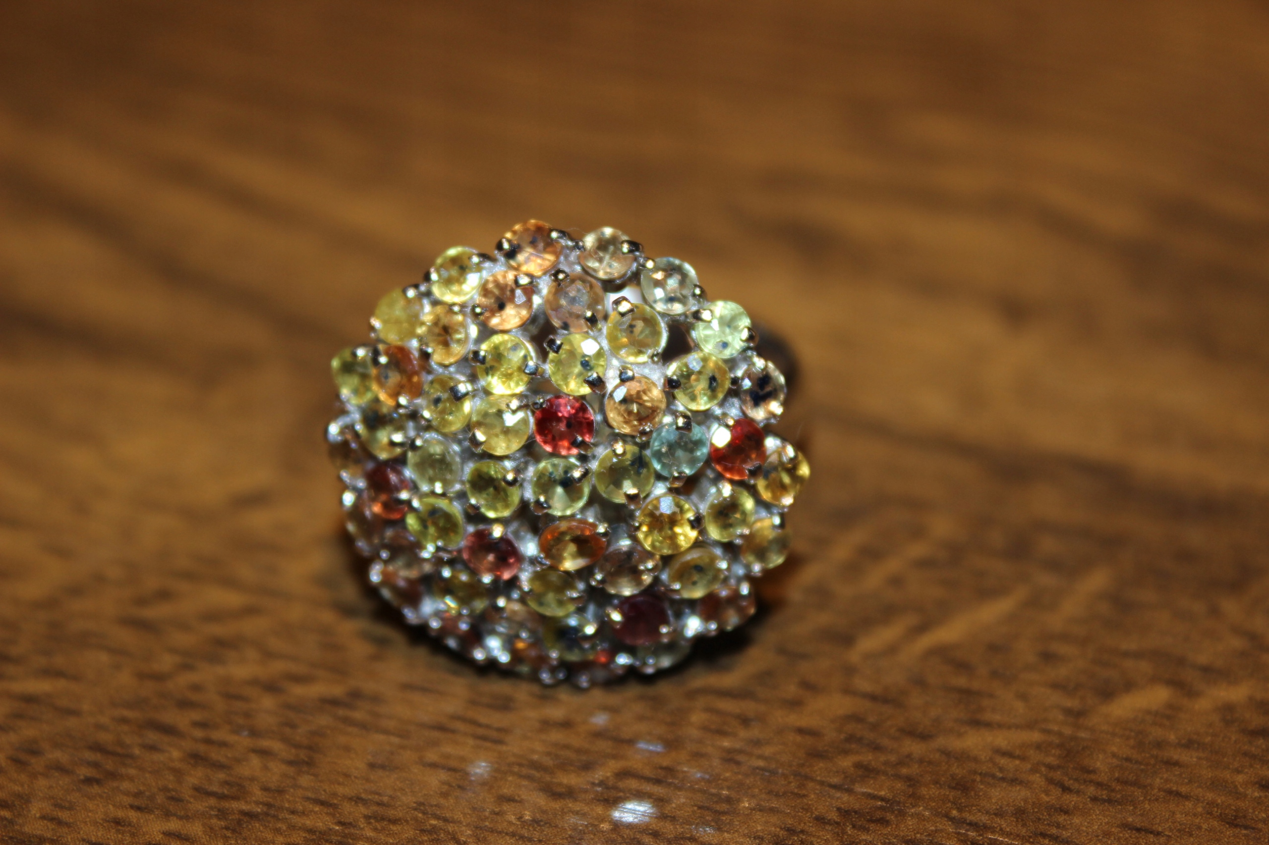 oferujemy Państwu nowy, pozłacany białym złotem, srebrny - próba 925 pierścionek z naturalnymi szafirami Songea padparadża. Szafiry są pięknie dobrane kolorystycznie, wielokolorowe.