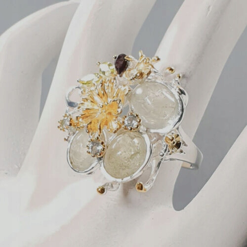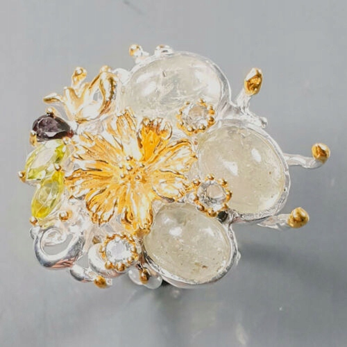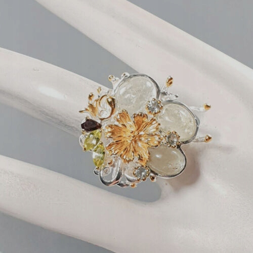 Oferujemy Państwu nowy, pozłacany żółtym i białym złotem, srebrny - próba 925 pierścionek z naturalnymi akwamarynami, oliwinami, topazami, i granatem.