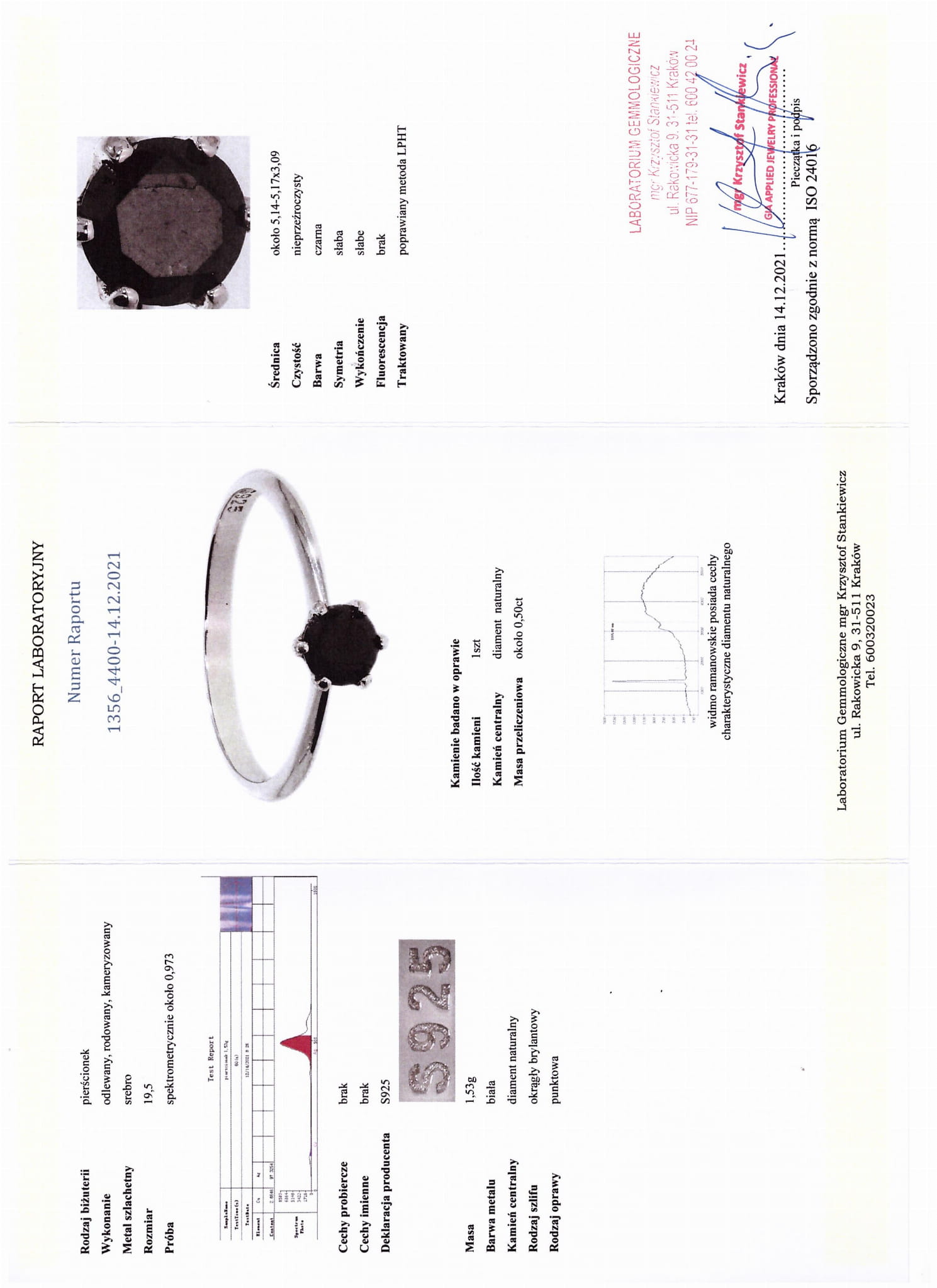 oferujemy Państwu nowy, pozłacany białym złotem 14K, srebrny - próba 925 pierścionek 0.5ct z naturalnym czarnym diamentem (poprawiany metodą LPHT). Pierścionek ma certyfikat i wycenę na kwotę 2000 zł.