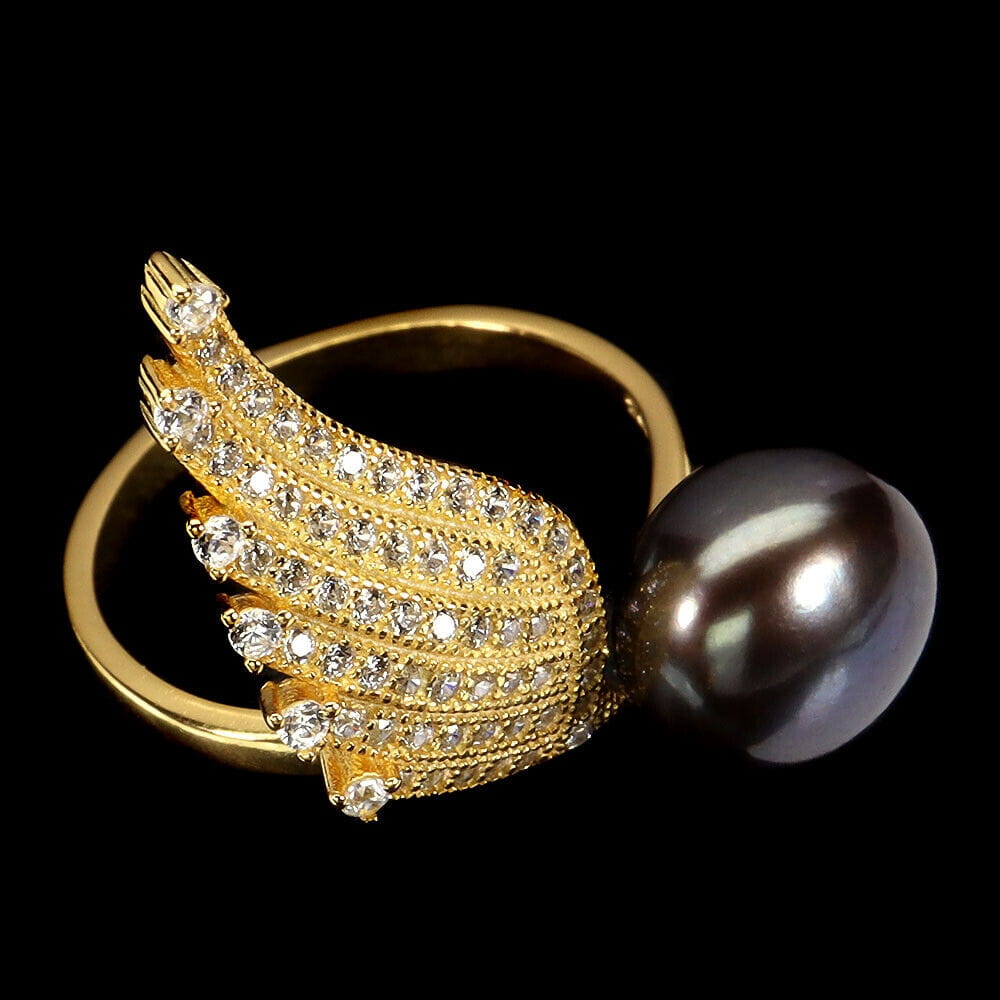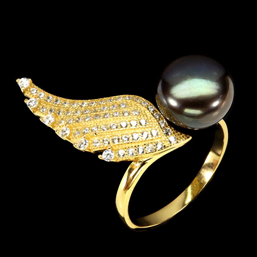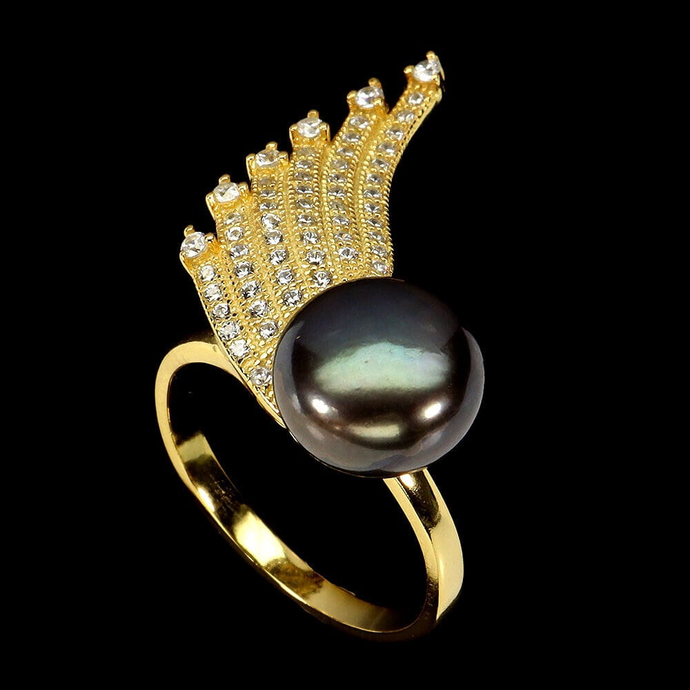 Oferujemy Państwu nowy, pozłacany żółtym 14K złotem, srebrny - próba 925 pierścionek z naturalną czarną perłą i cyrkoniami.