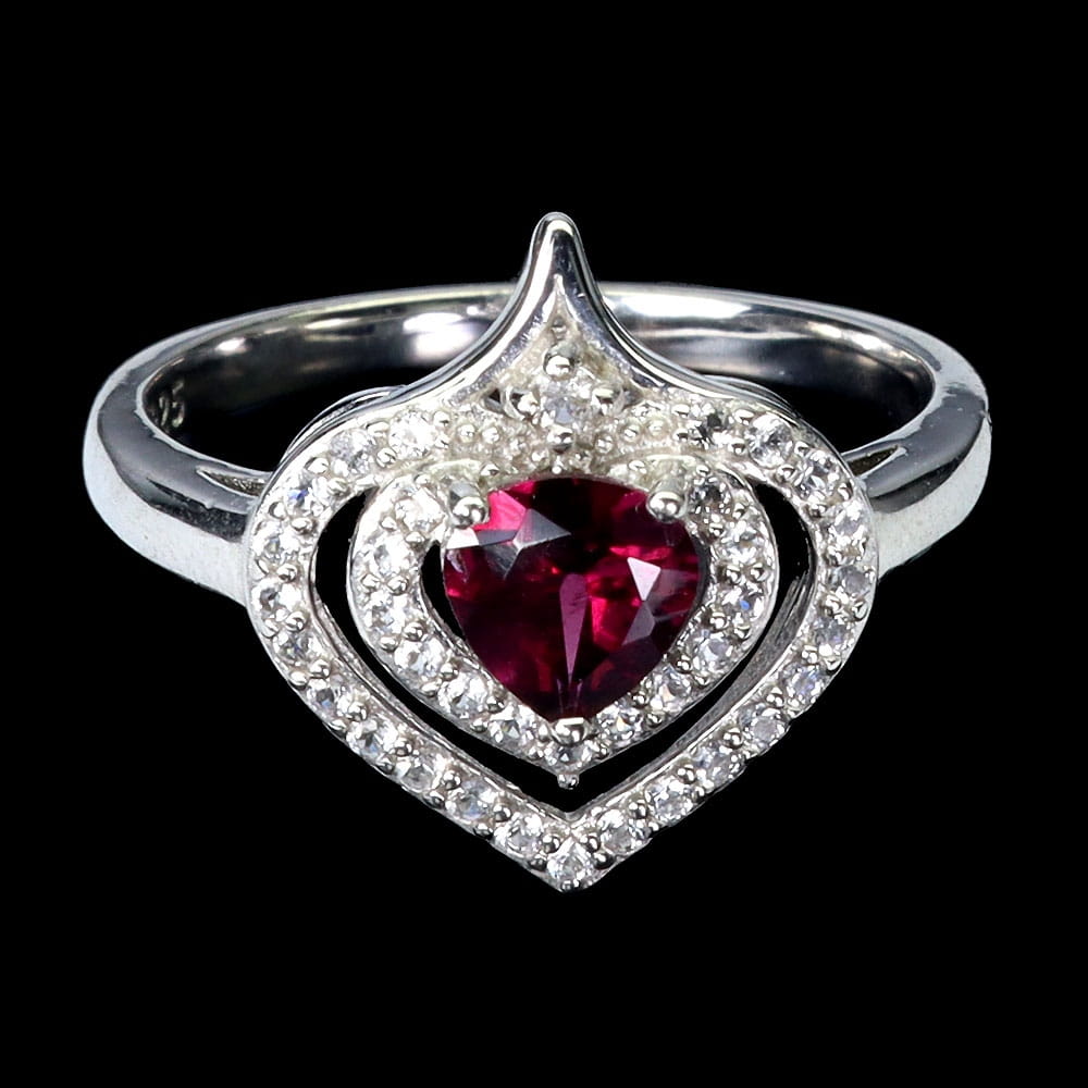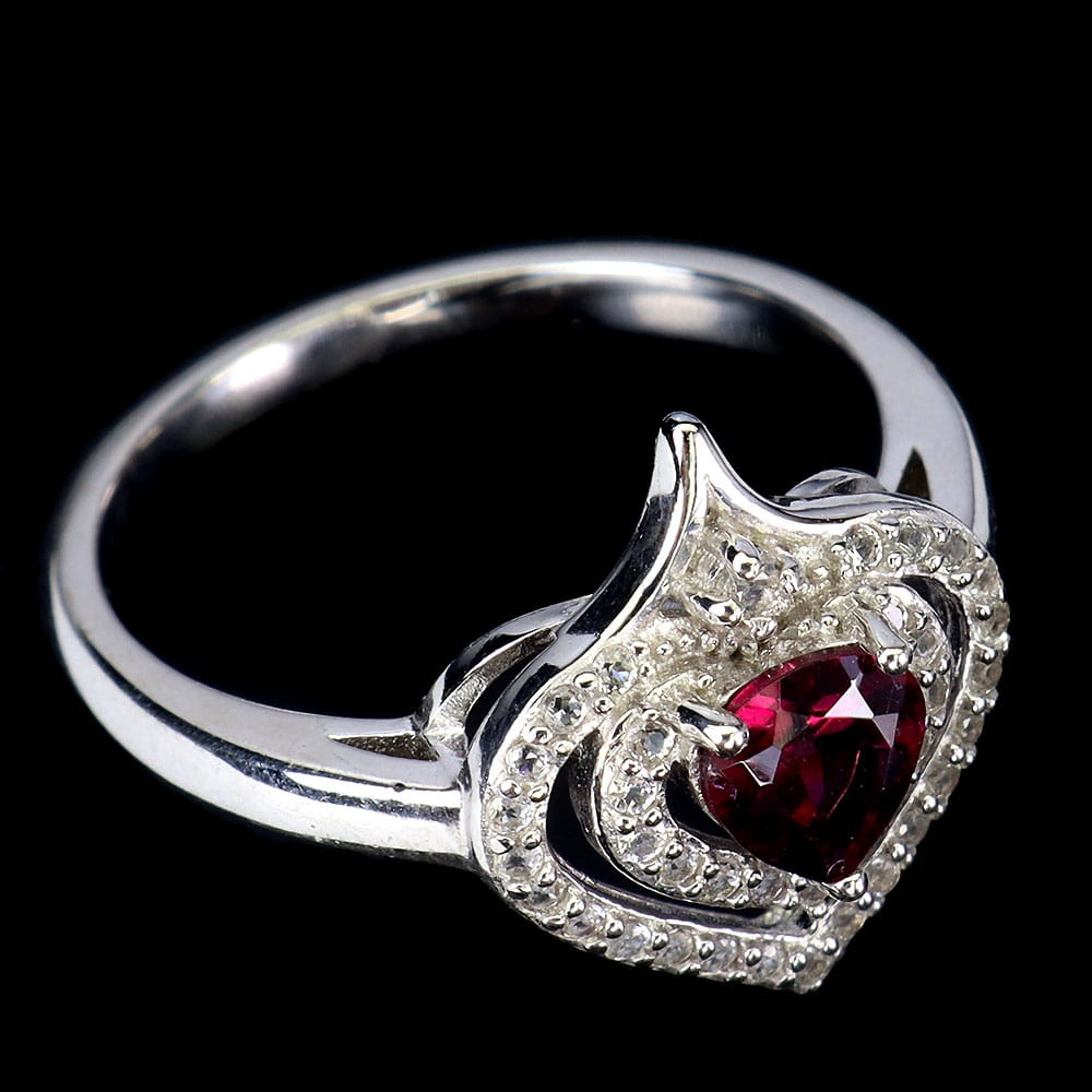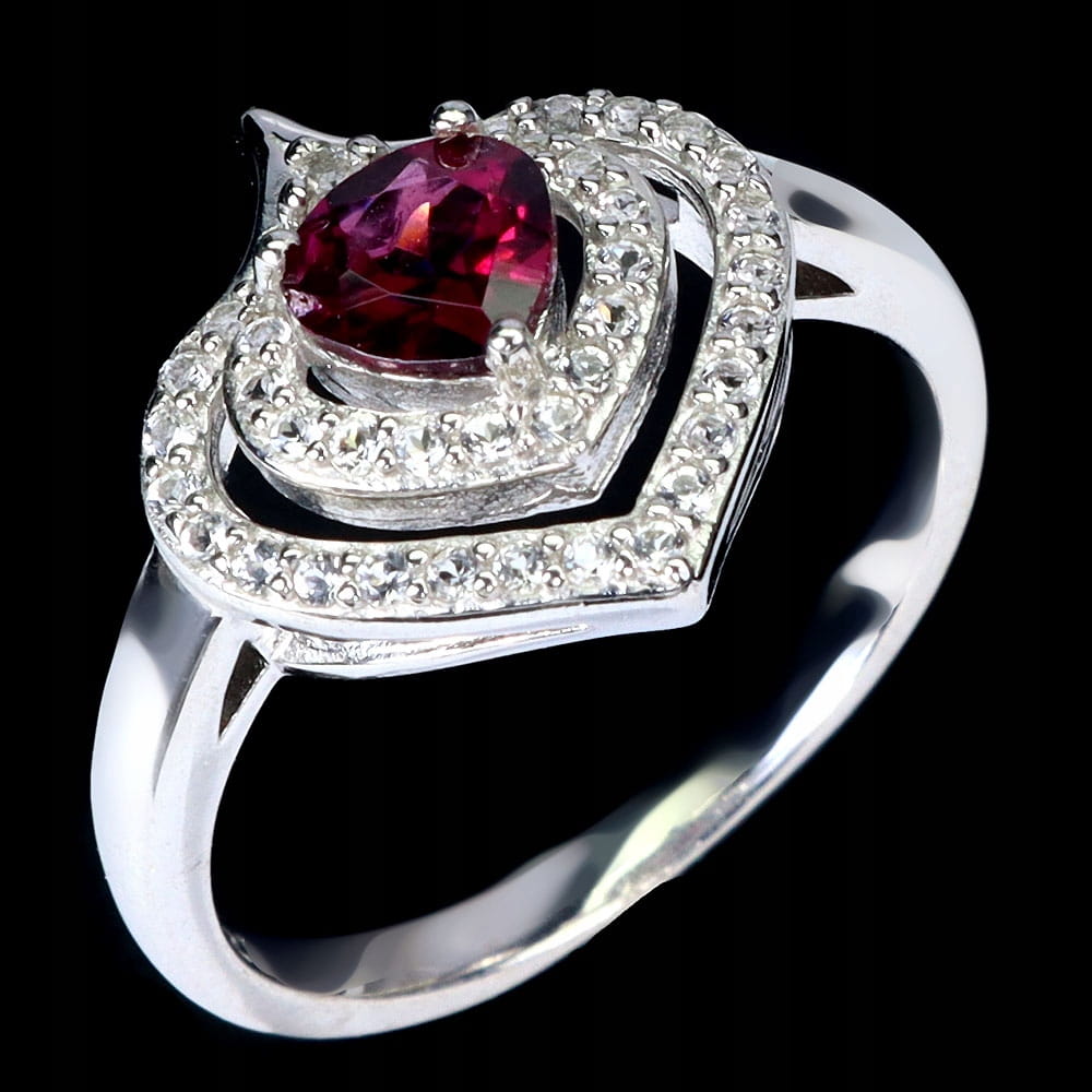 Pierścionek delikatny naturalny granat rodolit białe topazy r 12 serce