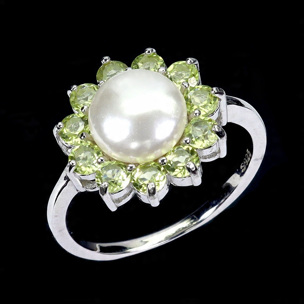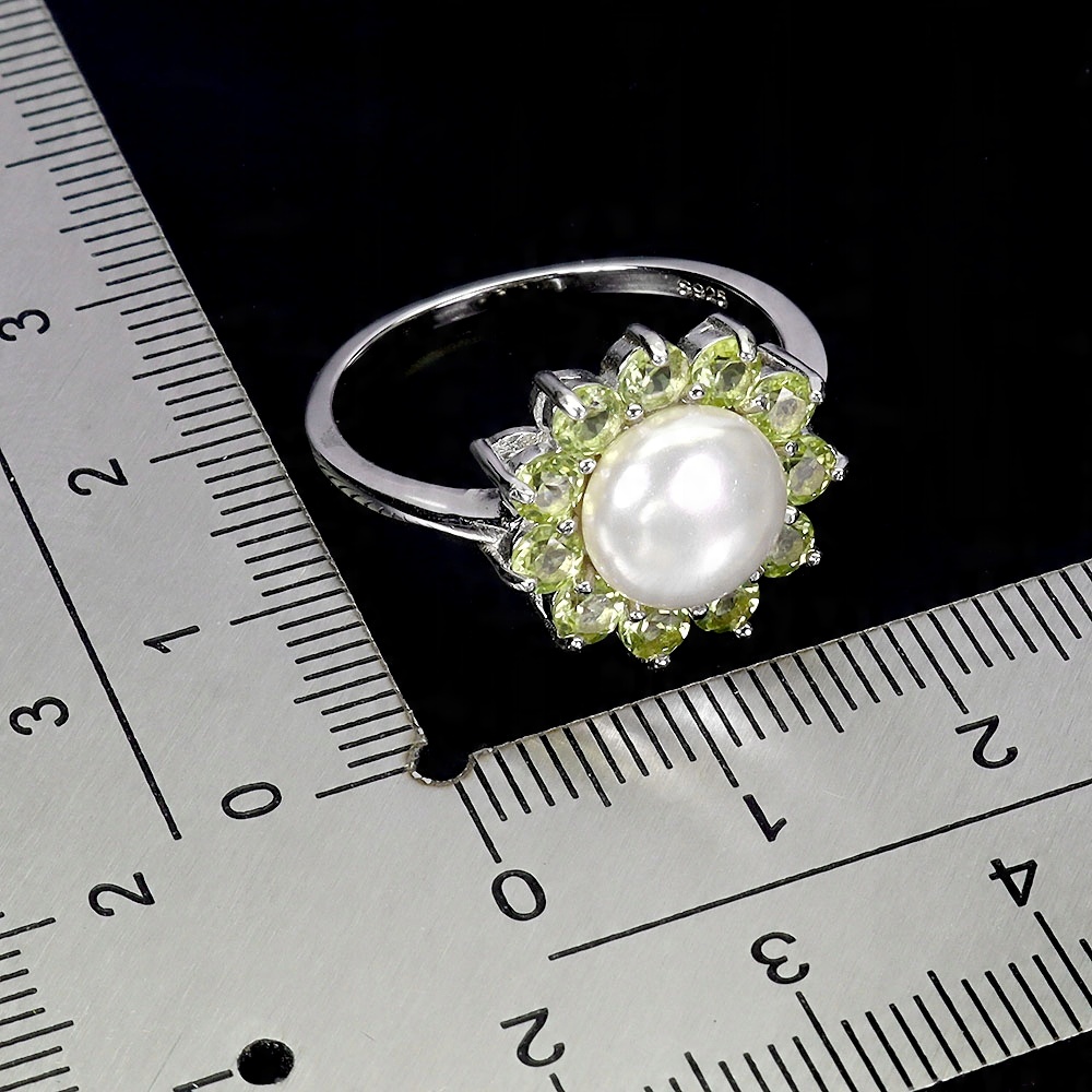 Oferujemy Państwu pozłacany 14K białym złotem, srebrny - próba 925 - pierścionek z naturalnymi oliwinami i imitacją perły.