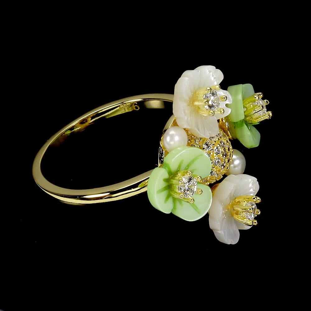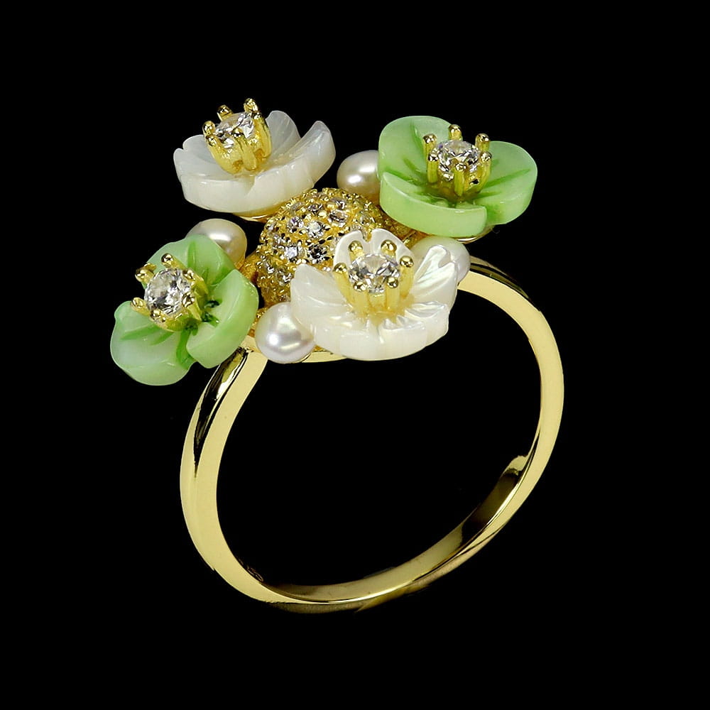 Centralną ozdobą jest naturalna masa perłowa o średnicy 8 mm, która tworzy subtelną, perłową bazę dla delikatnych, naturalnych pereł słodkowodnych o wielkości 3 mm oraz mieniących się cyrkonii. To połączenie nadaje pierścionkowi lekkości i elegancji, idealnej do noszenia zarówno na co dzień, jak i na wyjątkowe okazje.